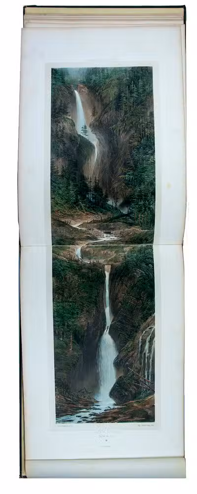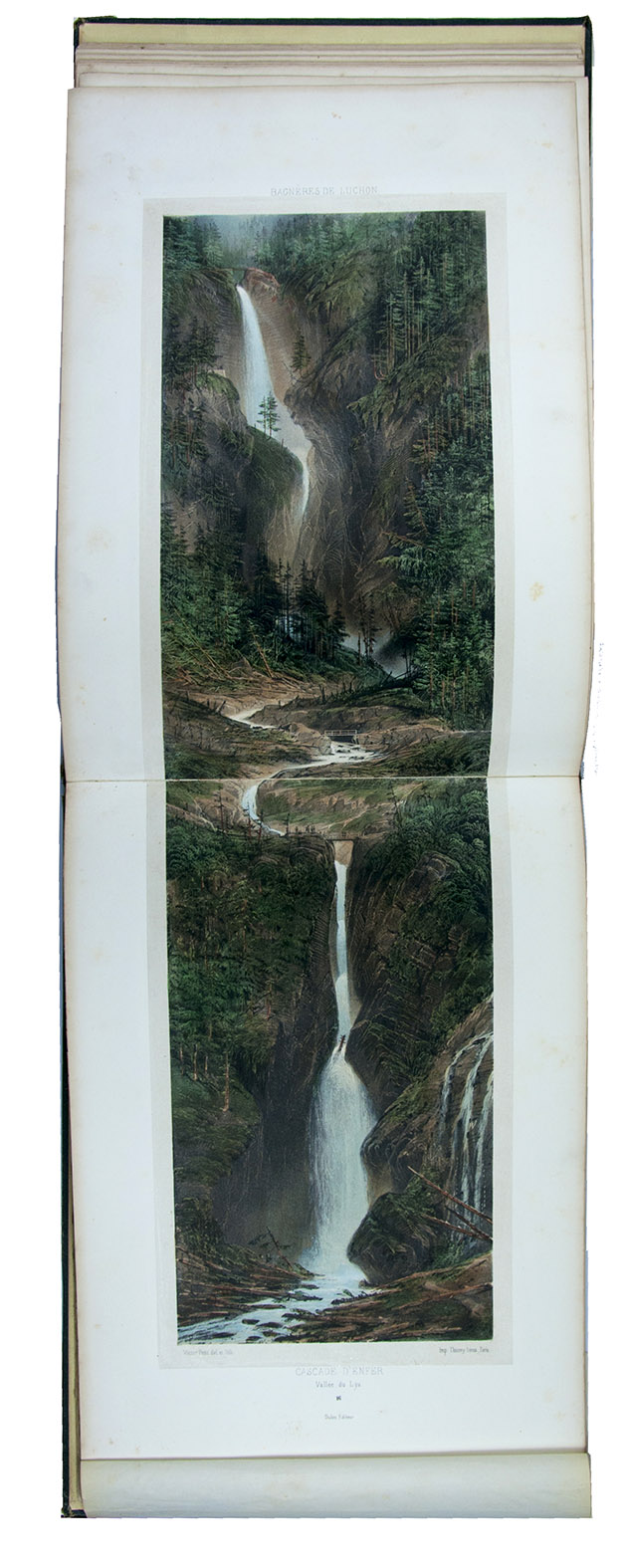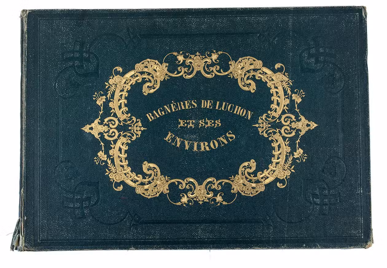 Attractive colour-plate book depicting the spa towns of Bagnères-de-Luchon, an area in the Pyrenees of southern France, adjacent to Spain. The illustrations show waterfalls, lakes, mountains, valleys, glaciers and some villages, each with a caption below the image and sometimes mentioning in the margins the names and heights of the mountains depicted. The plates are drawn and lithographed by the French artist Victor Petit (ca. 1817-1871) and printed by the Thierry brothers in Paris. Some of the plates were also inlcuded in Petit's Souvenirs des Pyrénées (1850).
