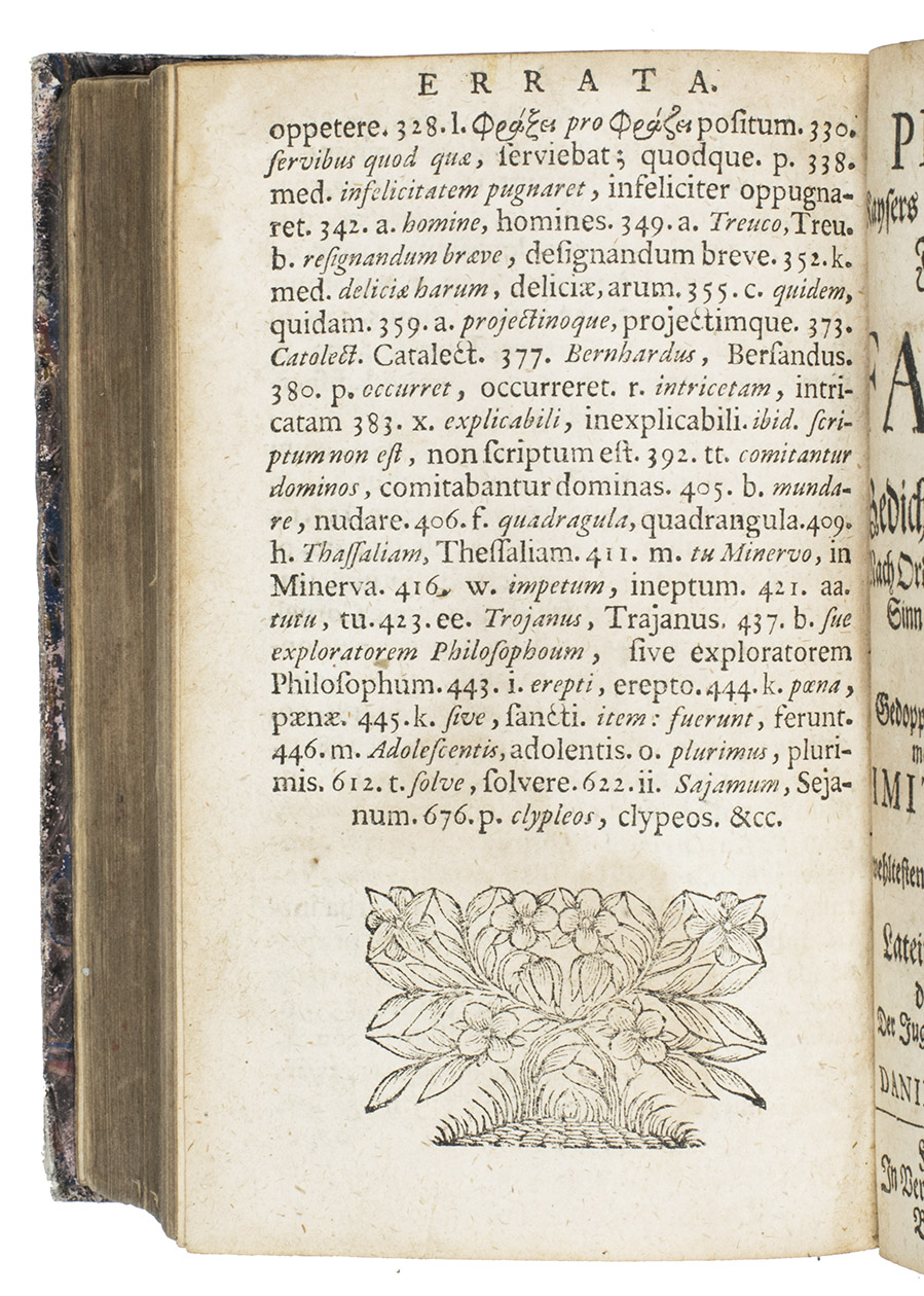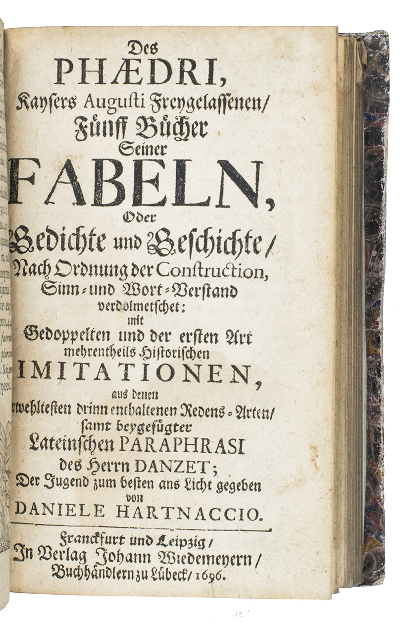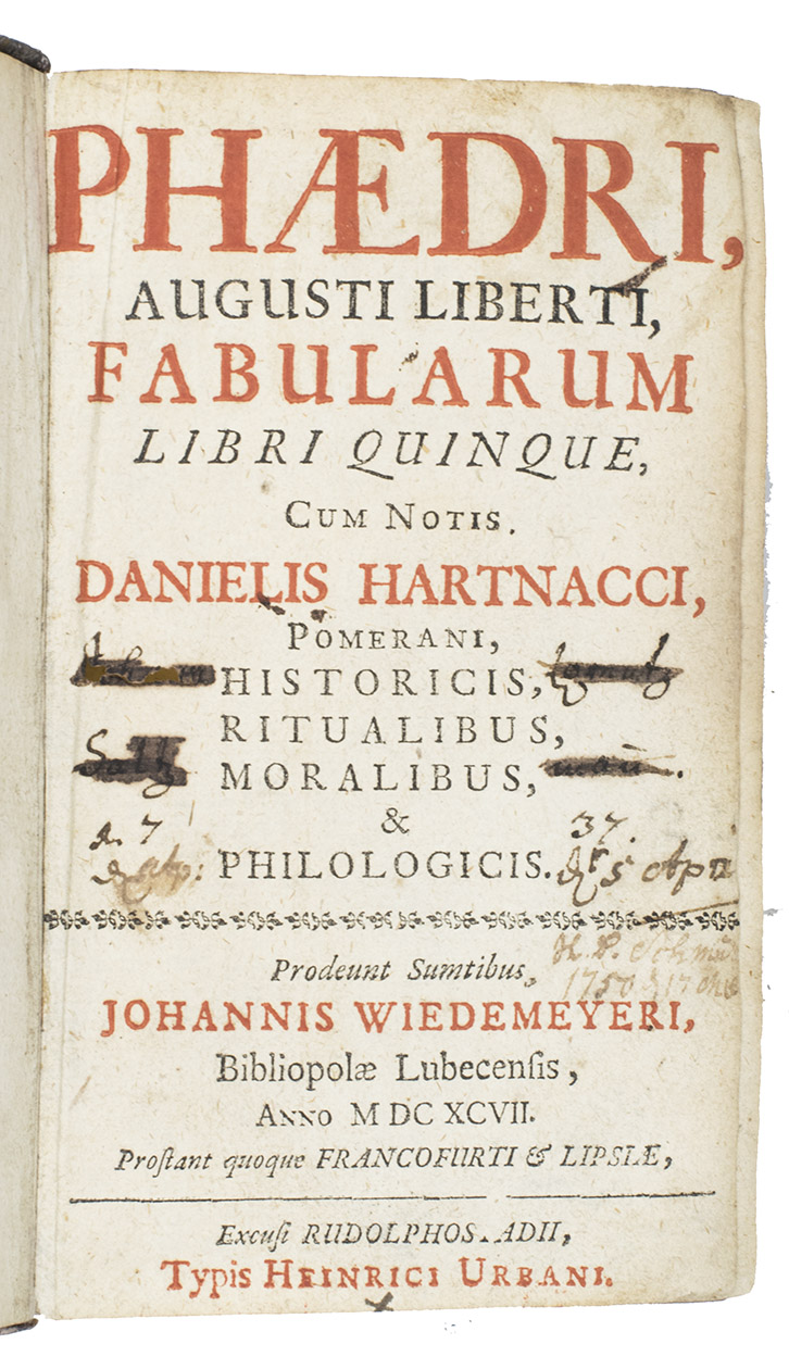 Ad 1: Phaedruss Fables in the original Latin verse (adapted from Aesops Greek prose), here in the first edition to include the incredibly extensive annotations, with abundant historical, moral and philological notes and explanations by Daniel Hartnack (1642-1708; also known as David Maphanafus), a professor and rector of the Latin Schools of Frankfurt a.d. Oder, Erfurt, Bremen and Altona. He also edited and translated several other classical Latin authors.