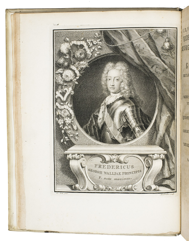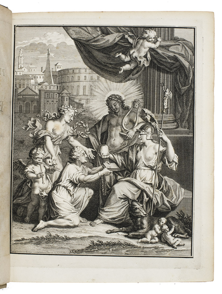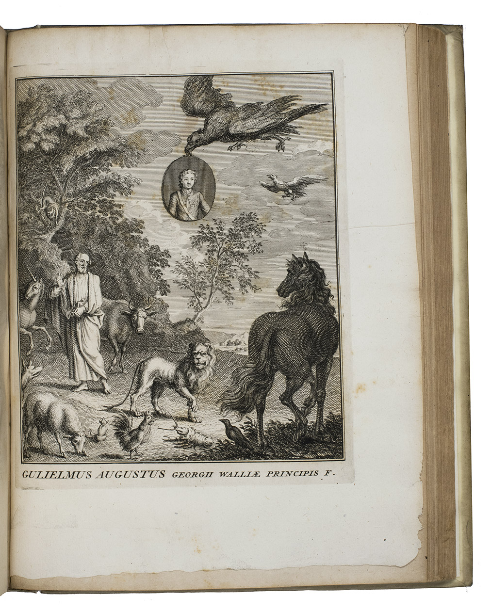 Amsterdam, R. & J. Wetstein, G. Smith, 1727. 4to. With a frontispiece of Aesop, including the portrait of William August (1721-1765) Duke of Cumberland. Vellum over thick boards, ruled in gold with gold corner pieces and a gilt stamp of Minerva with the coat-of-arms of The Hague in the center, ribbed spine gilt in compartments (price-binding of the Latin School in The Hague (Spoelder, The Hague, 3). [10], 88, [96] pp.
