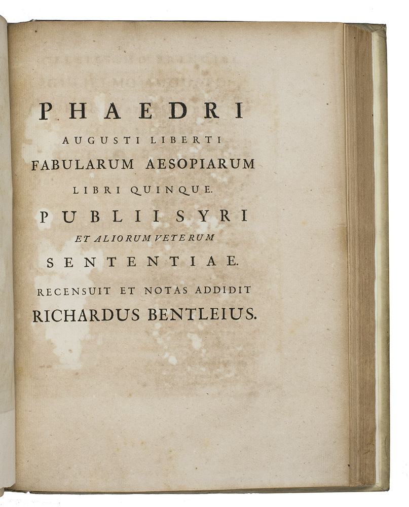 Second edition of the edition of the Phaedrus Fables, originally published in Cambridge and London, in 1726 by the world-famous philologist and classical scholar Richard Bentley (1662-1742), Master of Trinity College, Cambridge, considered the founder of historical philology.