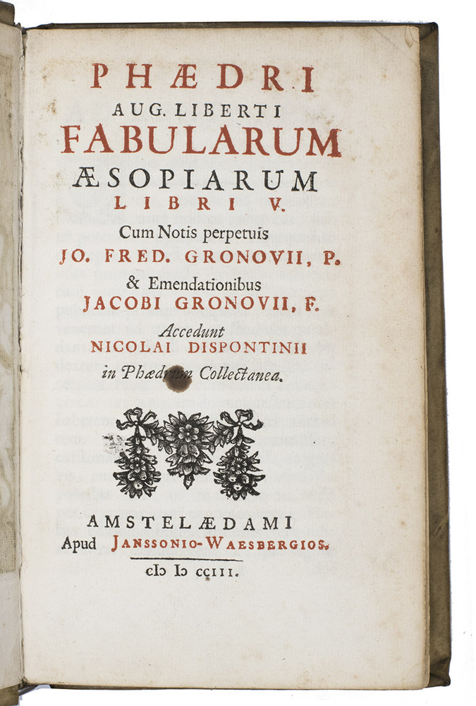 Amsterdam, Johannes Janssonius van Waesberge, 1703. 8vo. With an engraved frontispiece showing Phaedrus and Aesop on the stage of a theatre filled with men with animal-heads, title in red and black, some woodcut tailpieces and initials. Contemporary vellum, manuscript title on spine. [24], 156, [2], 157-218, 157-298, [2] pp.