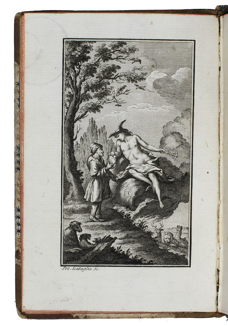 Venice, Thomas Bettinelli, 1787. 8vo. With engraved frontispiece of Mercure addressing Aesop by P. Scataglia after Etienne Fessard and Louis Durand, title in an ornamental engraved frame with the illustration for the first fable (the wolf and the lamb) by the same artist, some woodcut typographical head- and tailpieces. Half calf, ribbed spine gilt in compartments, lettered in gold, stamped ornamental paper over boards, red painted edges. [4], XXXII, 151 pp.