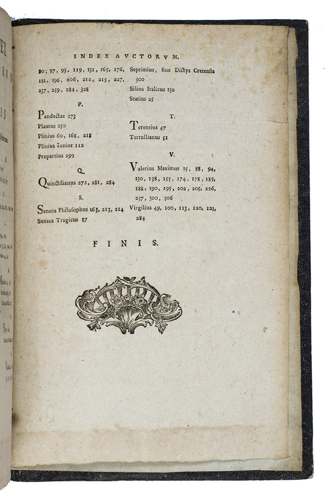 Mitau (now: Jelgava, Letland), Jacobus Fridericus Hinzius, 1773. 8vo. Some woodcut initials, head- and tailpieces. Sprinkled black 18th-century paper over boards with paper label on spine lettered in ink. L, [2], 328, [60] pp.
