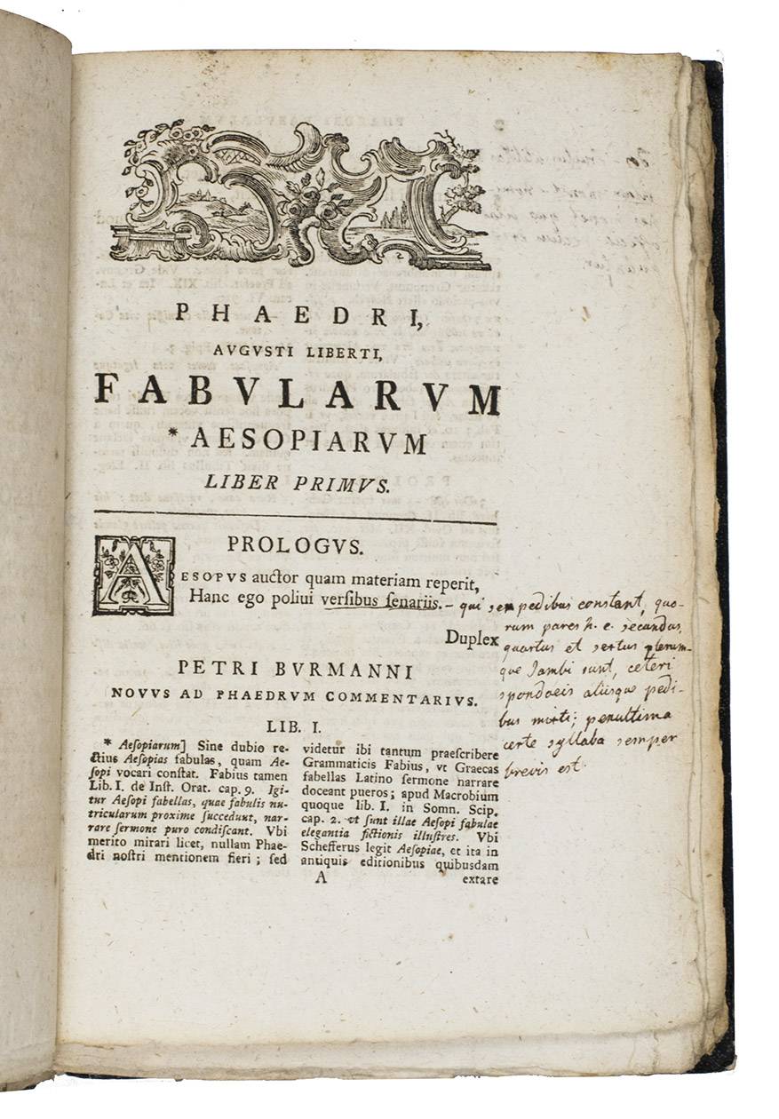 After his studies of Law and the classical languages in Utrecht, his native city, and Leiden, Petrus Burman the Elder (1668-1741) settled down to the practice of law, without, however, abandoning his classical studies. In 1696 he was nominated to the professorship of eloquence and history at the Utrecht University. To this chair was soon added that of Greek and politics. In 1724 he became the 9th Librarian of Leiden University. His first edition of the Fables of Phaedrus appeared in 1695 (see nr. 15).