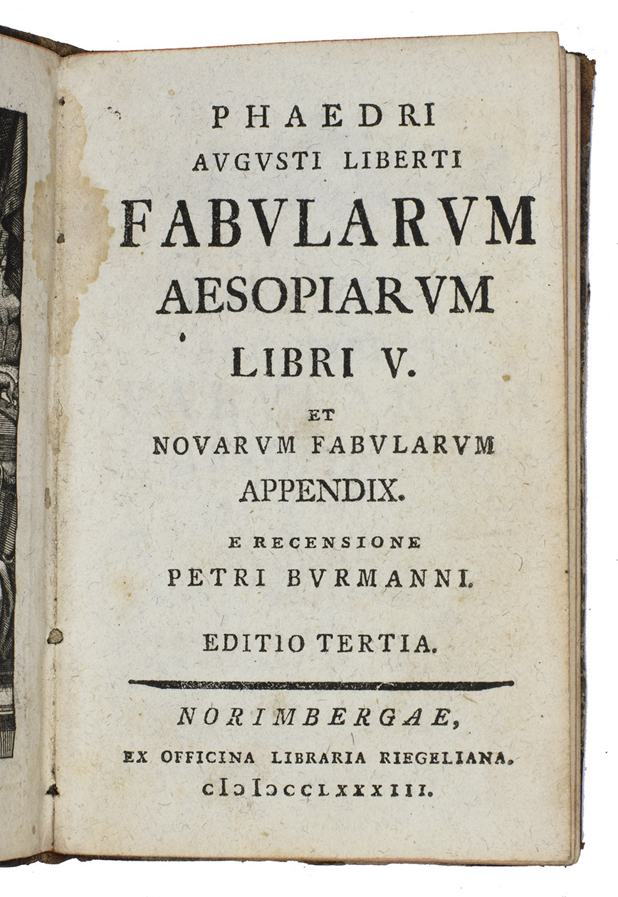 Apparently third edition of a little book containing only the text of the 94 Phaedrus Fables and the 34 Fables of the Appendix, including the fables found by Marquqtus Gudius (1635-1686), all in Latin verses, in the famous recension of Petrus Burmannus.