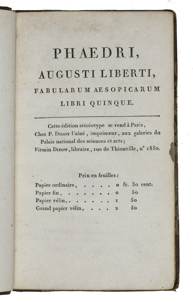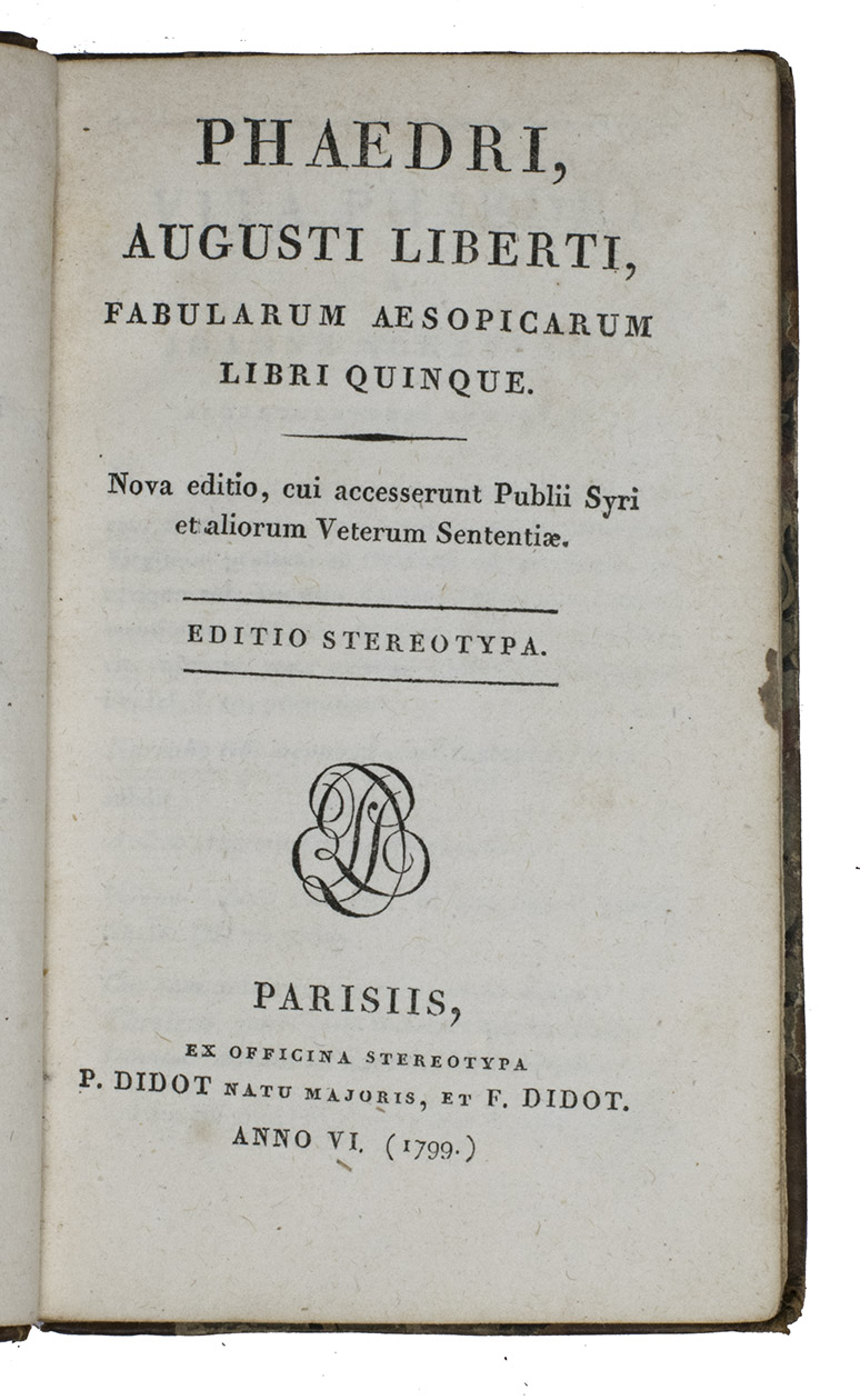 Phaedri, Augusti Liberti, Fabularum Aesopicarum Libri Quinque. Nova edition, cui accesserunt Publii Syri et aliorum Veterum Sententiae. Editio stereotypa.