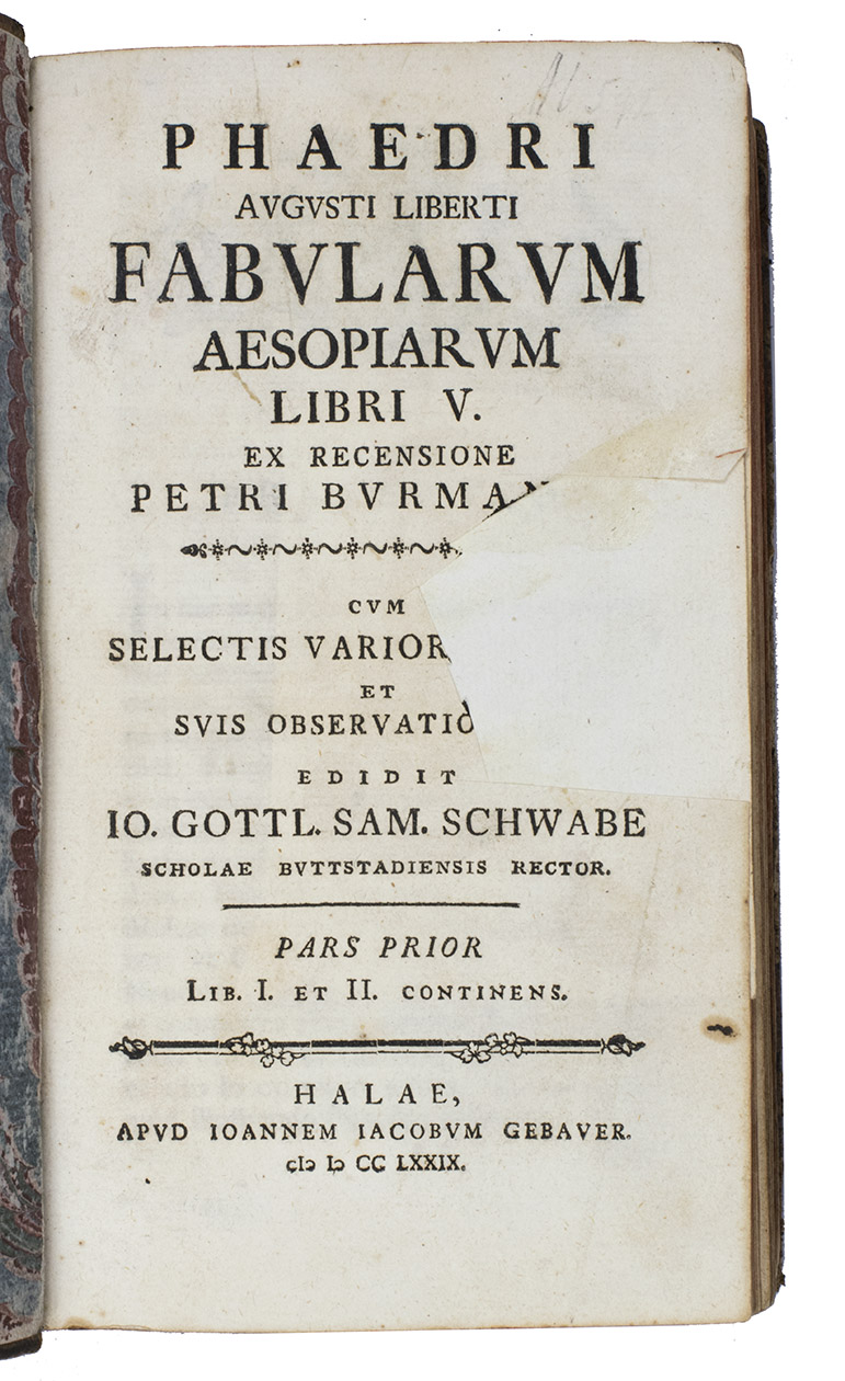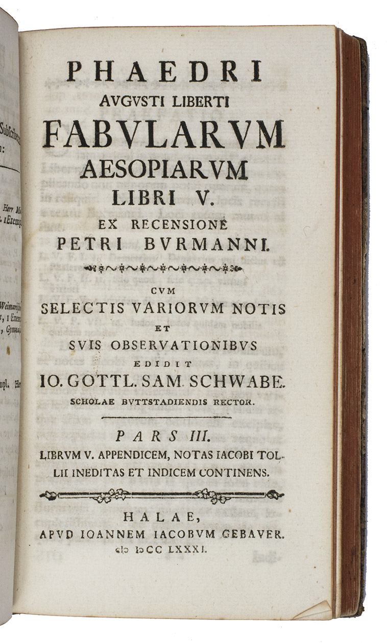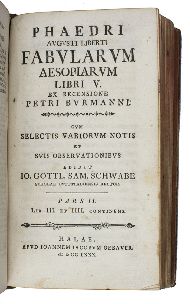 Phaedri Augusti Liberti Fabulorum Aesopiarum Libri V. Ex recensione Petri Burmanni. Cum selectis variorum notis et suis observationibus edidit Io. Gottl. Sam. Schwabe.