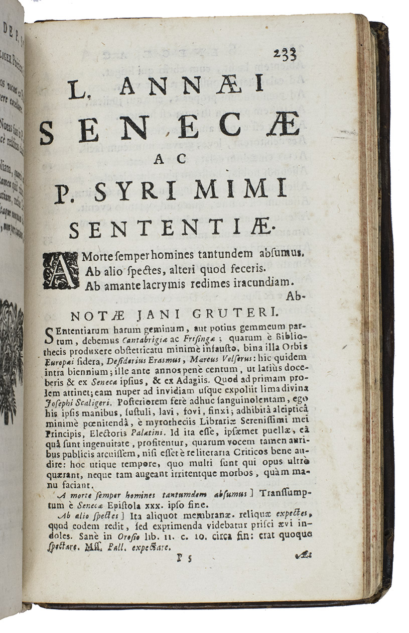 Sixth edition of this redaction of the Phaedrus Fables in verse together with the French translation on facing pages [except for Fable Lib.IV, XIV (p. 153): "LHonȇteté ne permet pas non plus quon traduise cette Fable"], after the fourth edition (Amsterdam, for Paul Marret, 1689), together with the annotations by Tanaquillus Faber (1615-1672), a French philologist and Professor of Greek at the University of Saumur, edited by J. Scheffer, who also added the congenial Sententiae by Publilius (often wrongly Publius) Syrus (fl. 85-43 BC), a Latin mime player and writer. All that remains of his corpus is this collection of Sententiae a series of moral maxims in iambic and trochaic verse. Each maxim consists of a single verse, and the verses are arranged in alphabetical order. In the course of time the collection was interpolated with sentences drawn from other writers, especially from apocryphal writings of Seneca the Younger. The Sententiae are published here with the preface by Faber, Testimonia, the few lines from Petronius Satyricon, ascribed to him, and the notes of Janus Gruterus (1560-1627), professor of History and librarian in Heidelberg.