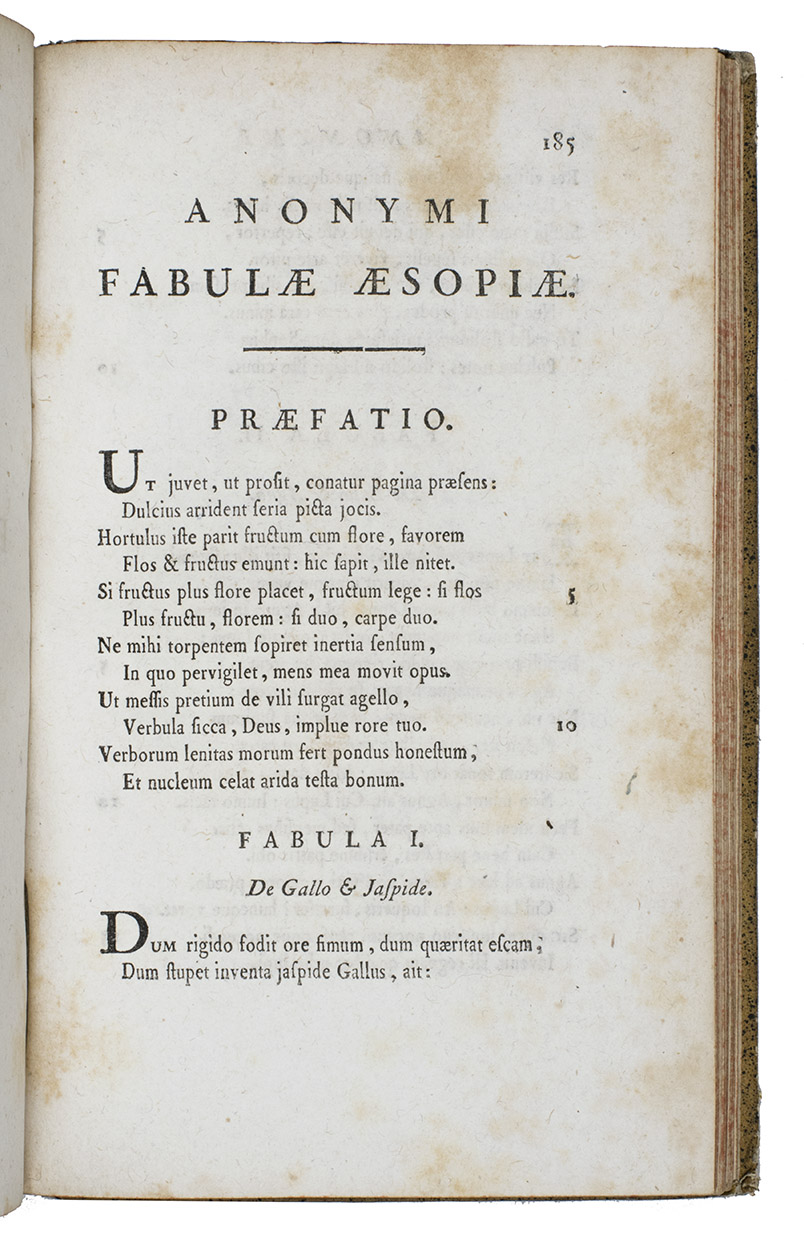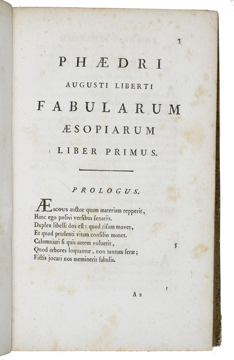 The well printed celebrated "Biponti society" edition of Phaedrus, part of a renowned series of Greek and Latin texts published in the German city of Zweibrücken (Biponti, a town near Sarbrücken), starting in 1779. The edition is partly based on the edition of Johann Albert Fabricius (1621-1736) as edited by Johann August Ernesti (1707-1781). Ultimately, however, the starting point of the edition was the Petrus Burman recension, with notes by Gudius and with fables added from the Romulus, the Niccolò Perotti (1430-1480) appendix and others, as well as the Avianus and Anonymous (i.e., "Anonymous Neveleti") fables mentioned. The book also contains the Vita Phaedri by Johannes Scheffer (1621-1679), and the "Notitia literaria de Phaedro ex Jo. Alb. Fabricii Bibliotheca Latina" by the editor Ernesti (pp. xiii-lii), and "De Anonymus vetere fabularum auctore..., latin. ed Ernesti" also by the editor.