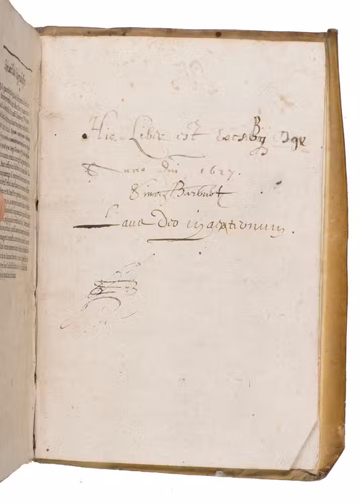 With the bookplate of physician J. J. Ballard mounted on the verso of the first flyleaf, numbered "265", the number 265 is also present as an inscription on the title page, together with the initials "BM", and a manuscript annotation on the last flyleaf by Simon Barbuot, dated 1627. The vellum is slightly soiled, with some loss of material in the back, showing the cardboard underneath. A loss in the outer margin of pp. 49 and 65, not affecting the text. Otherwise in good condition. Krivatsy 8997; Wellcome I, 5038; cf. Petry, "Many Things Surpass our Knowledge: An Early Modern Surgeon on Magic, Witchcraft and Demonic Possession", in: Social history of medicine 25.1 (2012): 47-64.