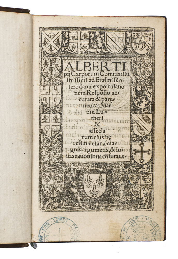 Alberti pii carporum comitis illustrissimi ad Erasmi Roterodami expostulationem resposio accurata & parenetica, Martini Lutheri & asseclarumeius he resim uesana magnis argumetis & iustis rationibus consutans.