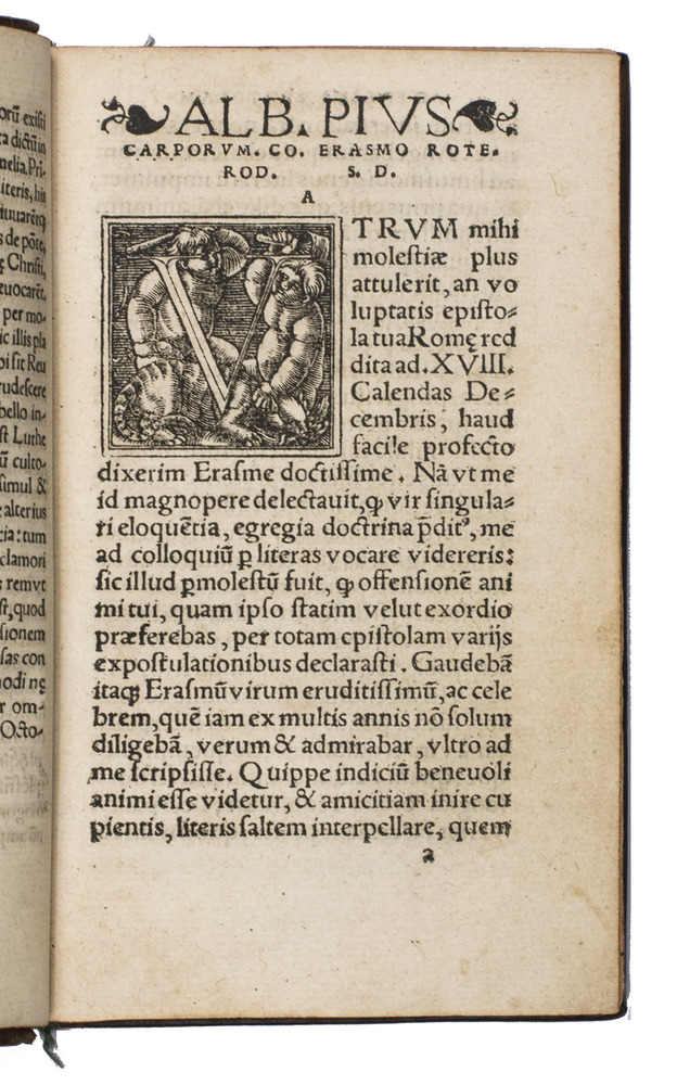 Ad 1: Unrecorded issue of the 1529 edition of Alberto Pios attack on Erasmus. Alberto III Pio (1475-1531), Prince of Carpi and a staunch defender of Catholic orthodoxy, composed this treatise as a direct attack on Erasmus and his theological ideas. In it, Pio accuses Erasmus of undermining the foundations of the Christian faith, sowing doubt about traditional theology, and indirectly aiding the cause of Luther and his followers. The work not only denounces Erasmuss ideas but also presents a systematic refutation of Lutheran "heresies".