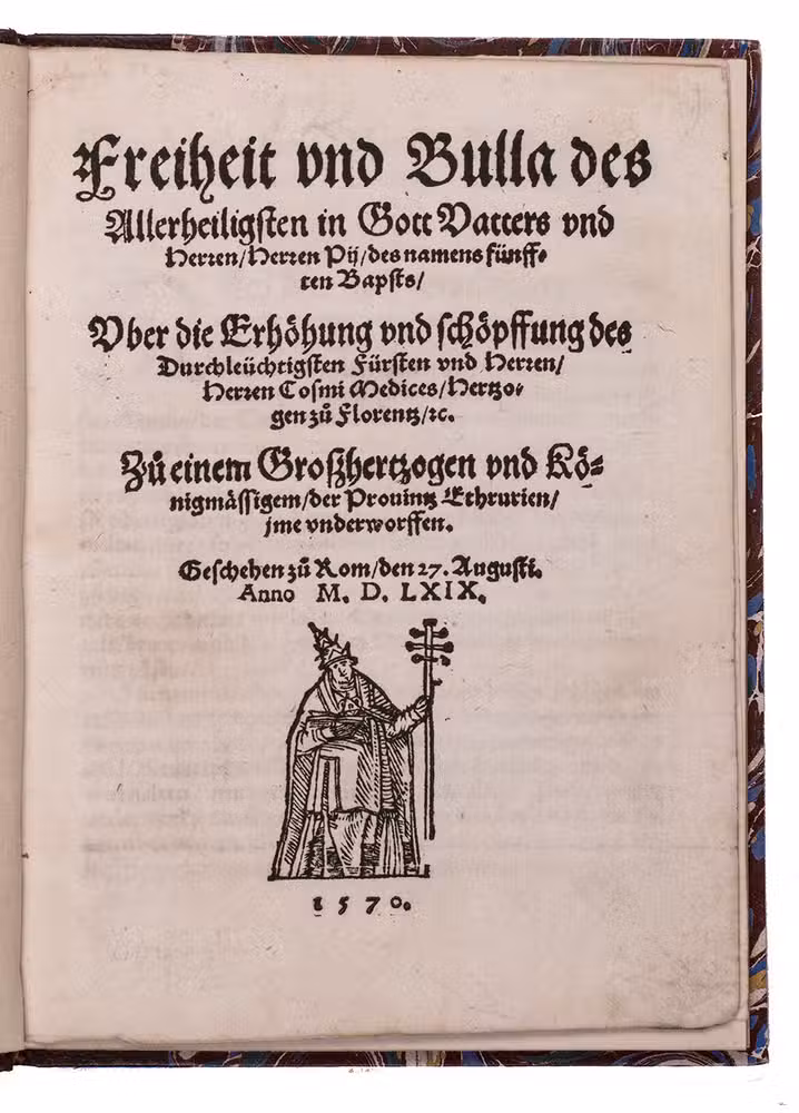 Freiheit und Bulla des allerheiligsten in Gott vatters und Herren, Herren Pii, des namens fünfften Bapsts, uber die Erhoehung und Schoepffung des durchleüchtigsten Fürsten und Herren, Herren Cosmi Medices, Hertzogen zu Florentz, &c. Zu einem Groszhertzoge und koenigmässigem, der provintz Ethrurien, ime underworffen. Geschehen zu Rom, den 27. Augusti. Anno M.D. LXIX.