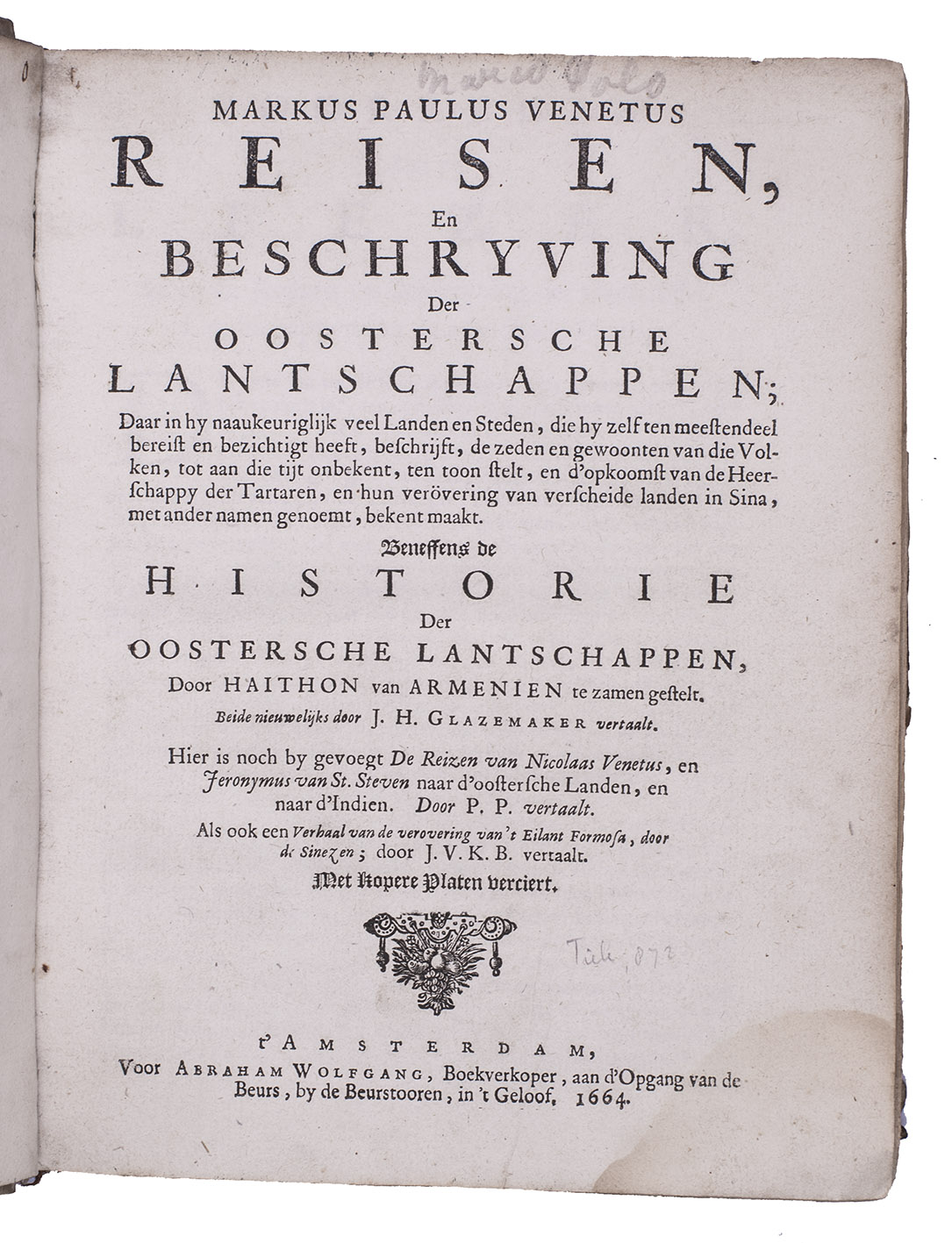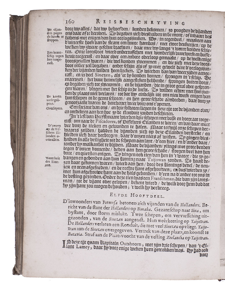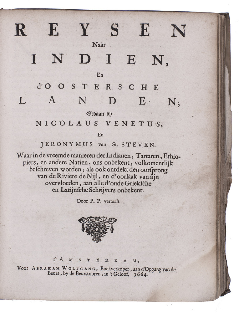 The present edition adds three further accounts of Far Eastern lands and peoples, all in their first Dutch editions. The first is that of Hetoum of Corycus (ca. 1240-ca. 1315). The second additional text is the humanist Poggio Bracciolini's account of the travels of the Italian merchant Niccolò de' Conti (ca. 1395-ca. 1469) from Venice via Syria, where he learned Arabic, Bagdad, around the Arabian peninsula to the Gulf and Iran, where he learned Persian, to India, the East Indies, Southeast Asia, possibly southern China and back in the years 1419-1444. His linguistic skills make his testimony especially valuable. Finally, a 12-page appendix, gives what appears to be the first eye-witness account of the capture of the Dutch-controlled island of Formosa (Taiwan) by the Chinese pirate Zheng Chenggong (1624-1662) in 1661/62. It also gives information on the VOC's trade, taxation and relations with Chinese colonists and indigenous "wilden" (wild men).