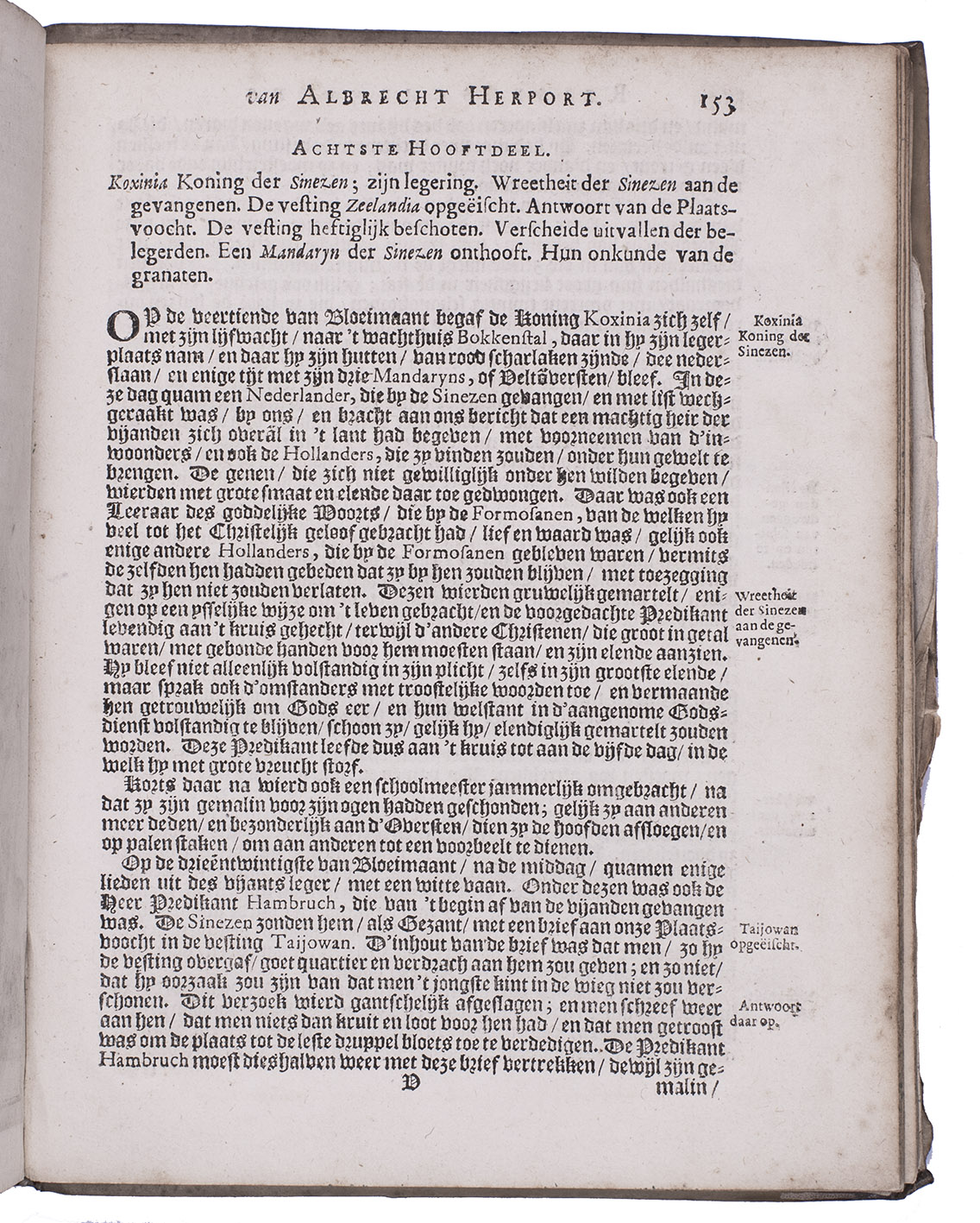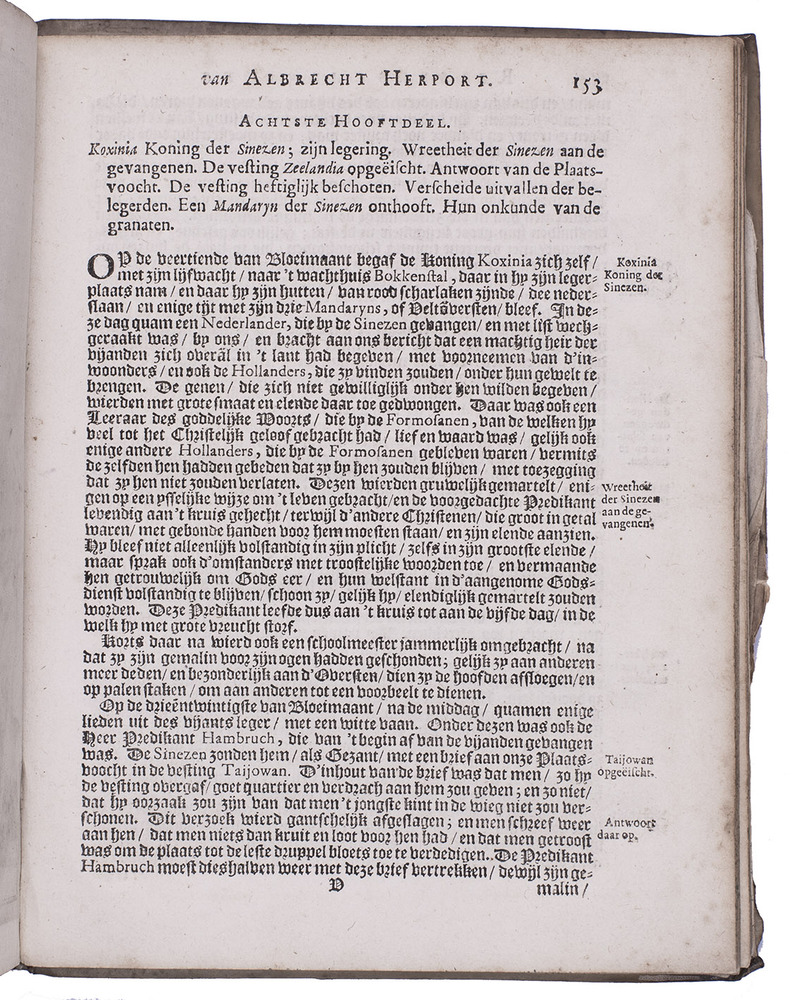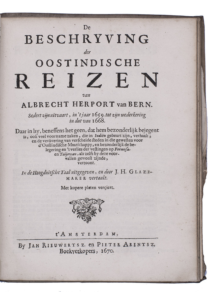 Albrecht Herport, a Swiss soldier born in Bern, joined the VOC in Amsterdam in 1659 and sailed in the ship Malacca to Batavia, surviving an attack by pirates on the way. His present journal "is particularly valuable for its highly detailed accounts of the Dutch military campaigns with which Herport was personally associated" (Howgego).