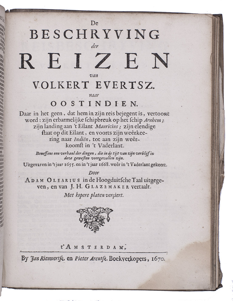 -OLEARIUS, Adam. De beschryving der reizen van Volkert Evertsz. [= Volquard Iversen] naar Oostindien. ... uitgevaren in ... 1655. en in ... 1668 ... gekeert.