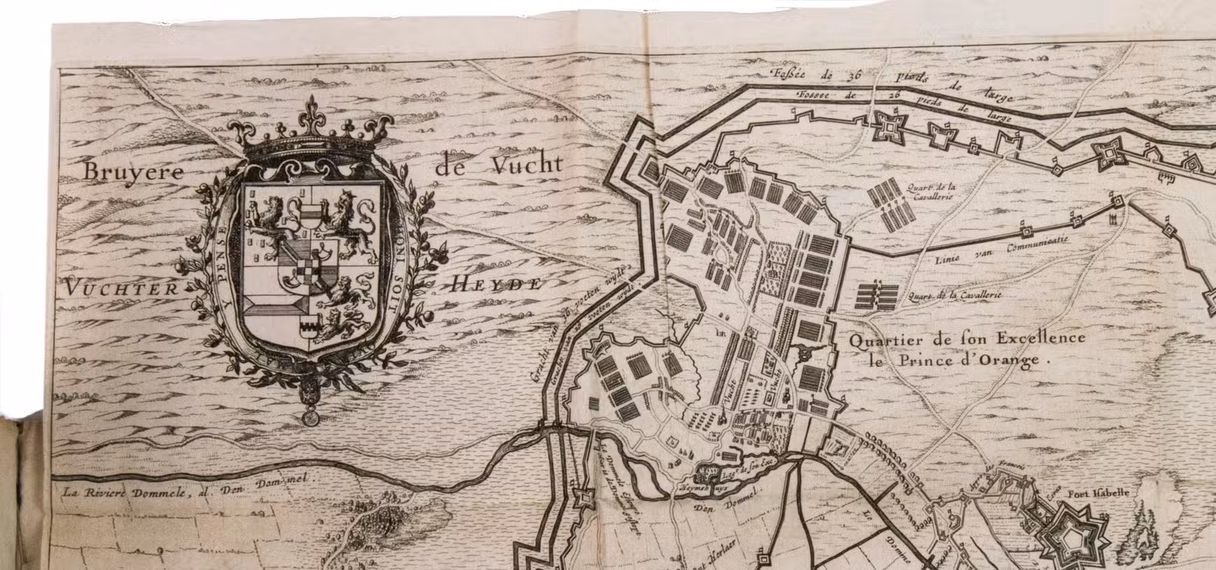 The detailed plans show the approach of the city from different directions by the Dutch army. These approaches were respectively conducted under the command of Prince Frederick Henry of Orange, Count Ernest Casimir of Nassau, Count Willem of Nassau, Baron Van Brederode, and Pinsen, the Governor of Rees. The siege was very challenging due to the swamps surrounding the city, but Frederick Henry was able to drain them. The last of the plans shows the camp of the Count of Solms and the water-mills which were used for this, the working of which is demonstrated on two insets. All the plates were drawn by the author, Jacques Prempart (dates unknown), who was a military engineer, and engraved by Henricus Hondius II (1597-1651).