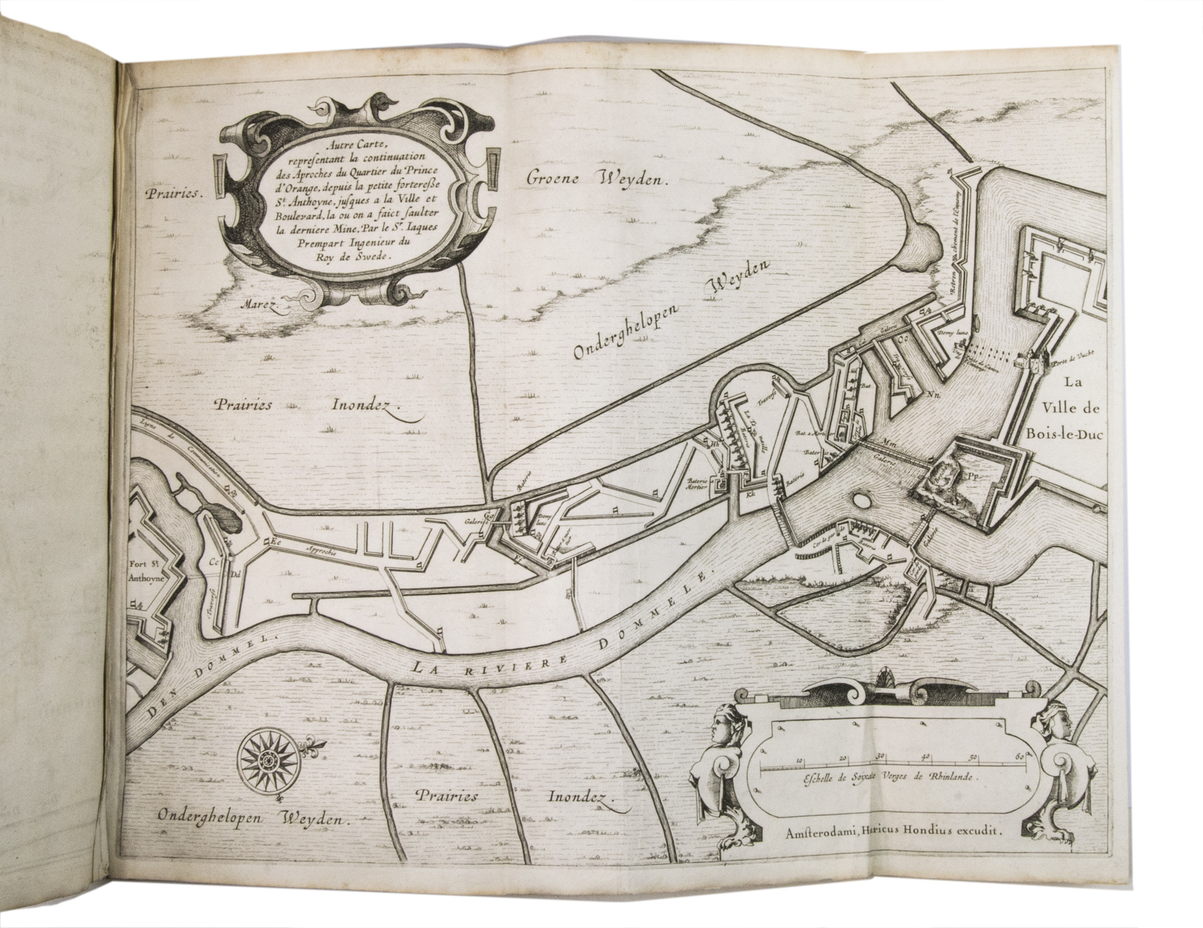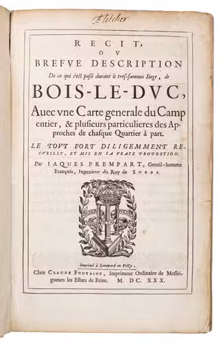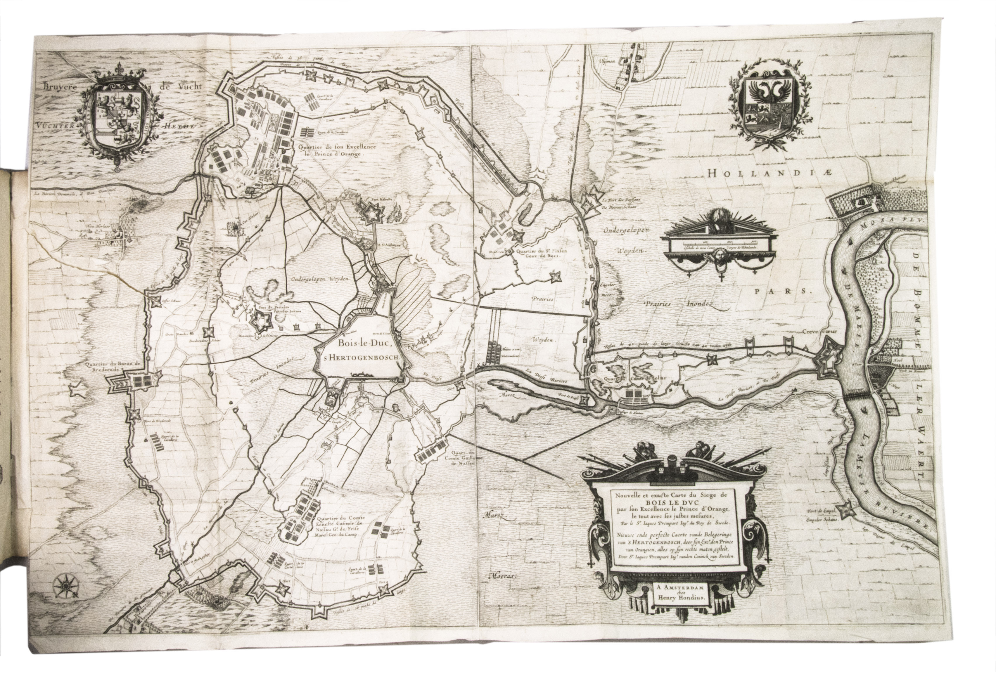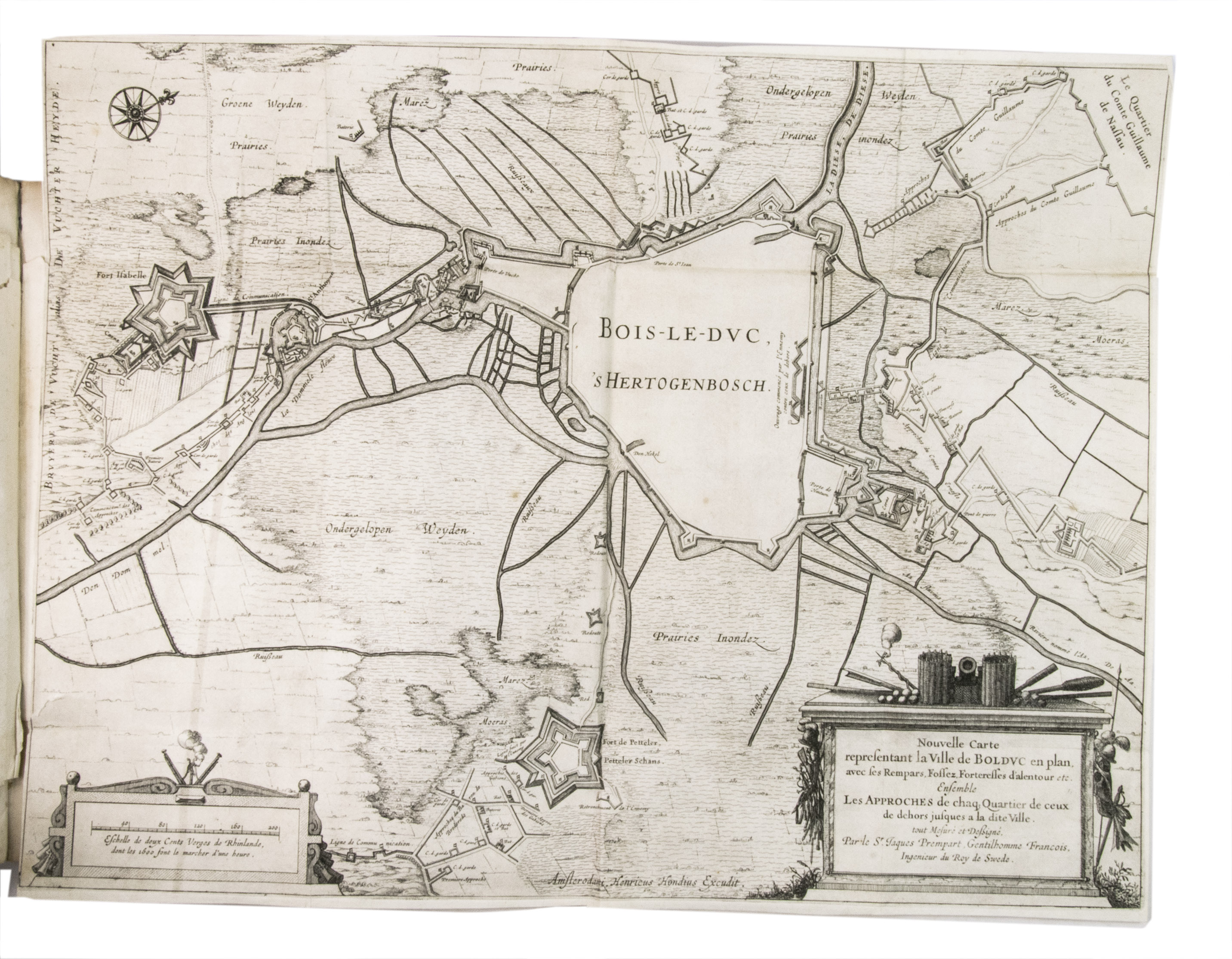 Very rare account of the famous siege of 's Hertogenbosch in North-Brabant in the summer of 1629, illustrated with large maps and plans. The city was in the hands of the Spanish, but the Dutch, commanded by Prince Frederik Henry of Orange, were able to capture it. The text presents a detailed account of the actions the besieging army, including the final victory and the taking of the city. Added are also the articles of surrender for the civil government of 's Hertogenbosch as well as for the military governor, Baron Van Grobbendonck, and his Spanish army. The present copy comes from the library of the Scottish writer and politician Andrew Fletcher of Saltoun (1655-1716).