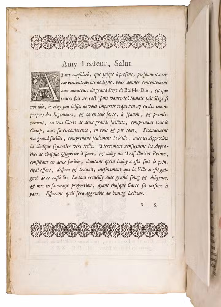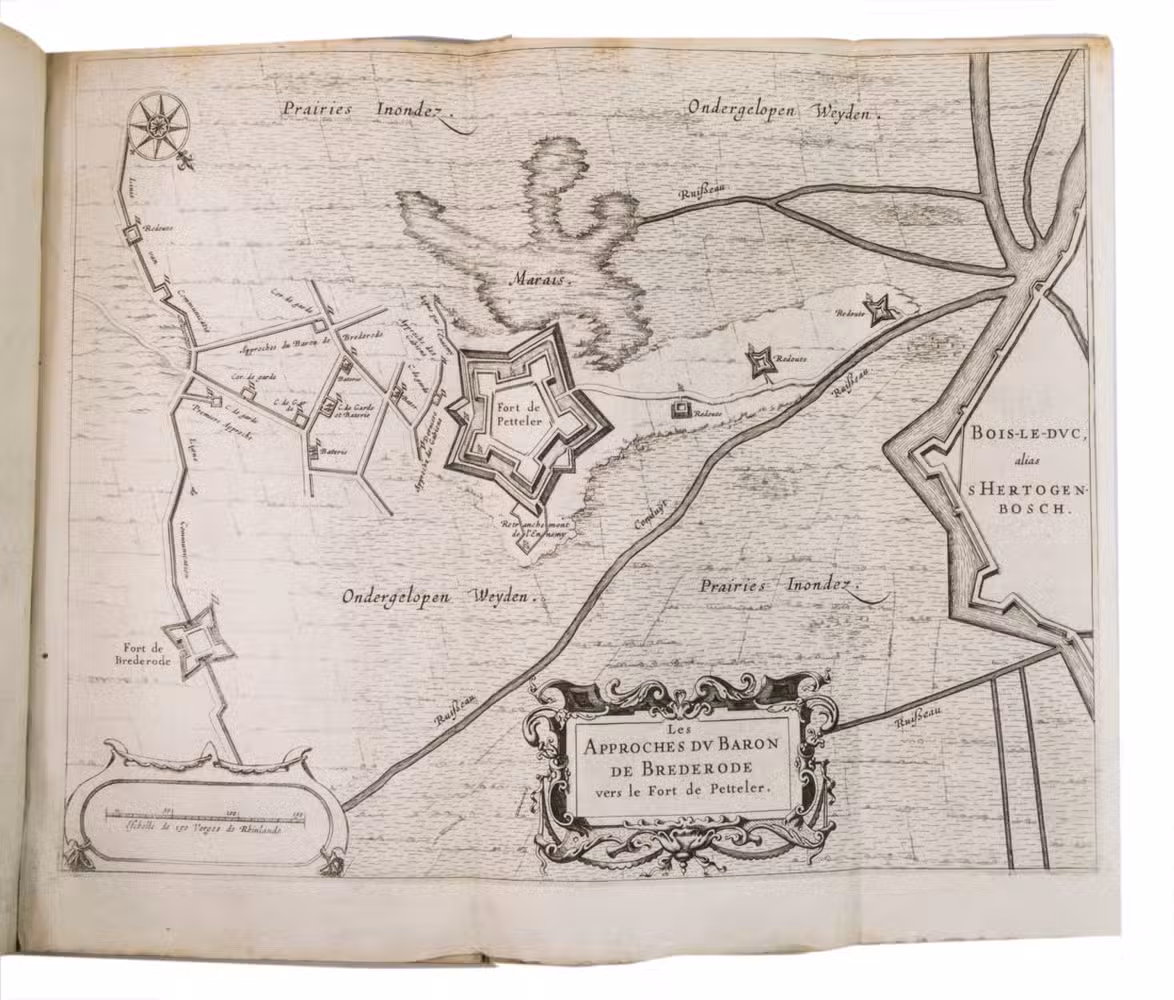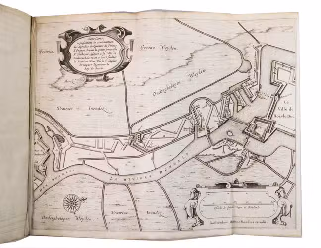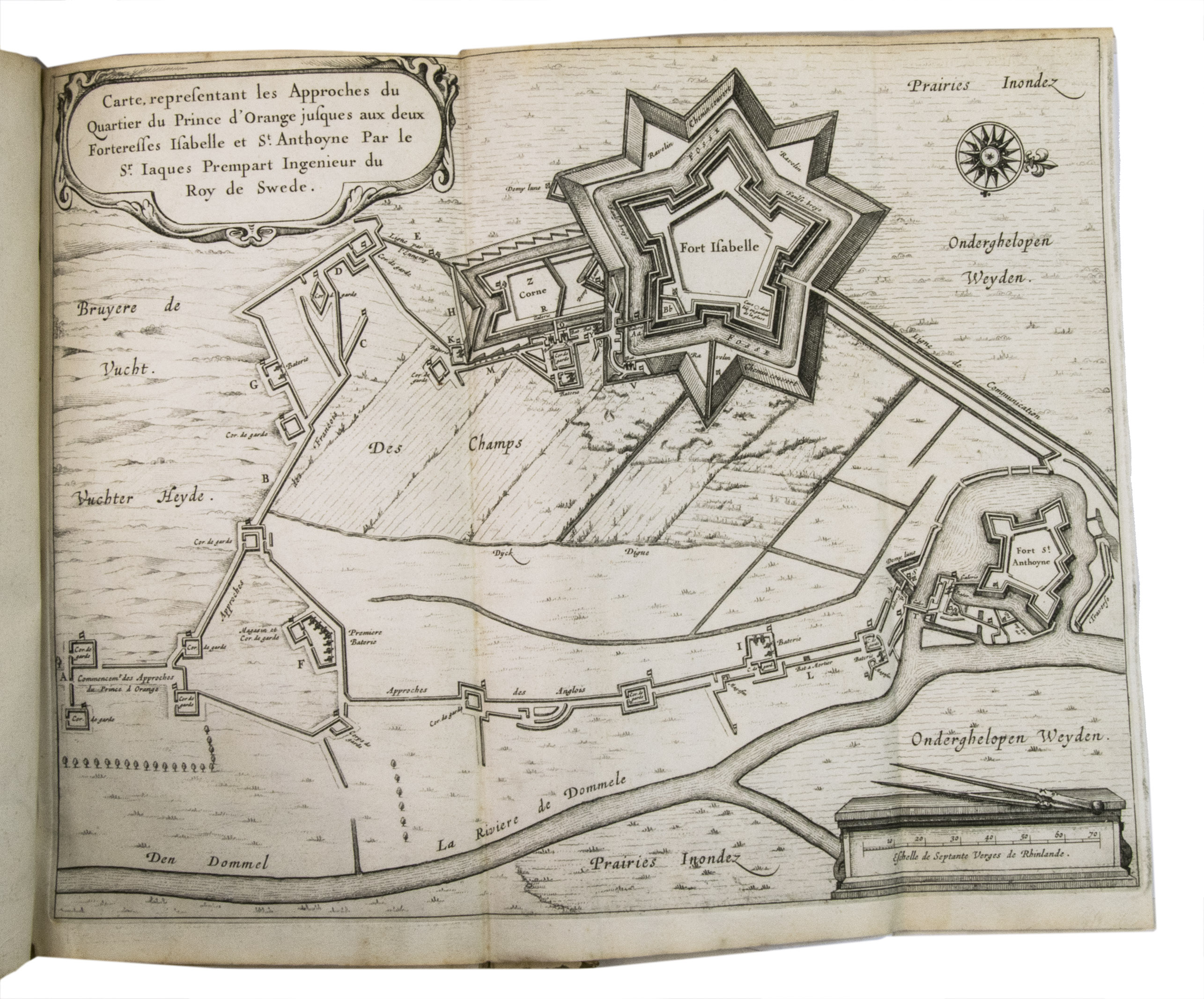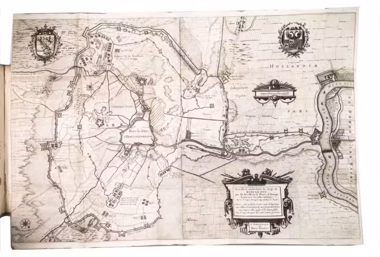 Very rare account of the famous siege of 's Hertogenbosch in North-Brabant in the summer of 1629, illustrated with large maps and plans. The city was in the hands of the Spanish, but the Dutch, commanded by Prince Frederik Henry of Orange, were able to capture it. The text presents a detailed account of the actions the besieging army, including the final victory and the taking of the city. Added are also the articles of surrender for the civil government of 's Hertogenbosch as well as for the military governor, Baron Van Grobbendonck, and his Spanish army. The present copy comes from the library of the Scottish writer and politician Andrew Fletcher of Saltoun (1655-1716).