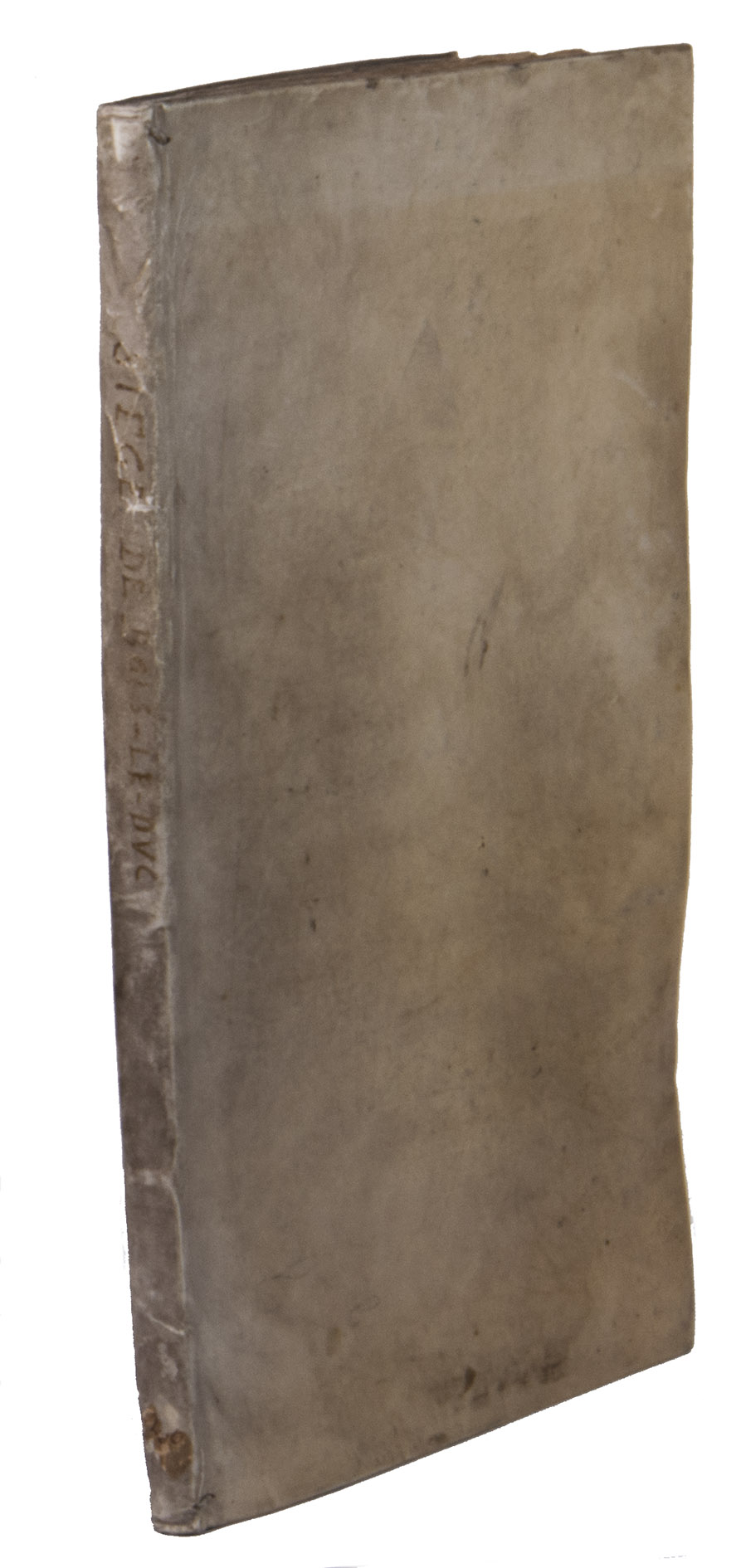 Leeuwarden, Claude Fontaine, 1630. Folio. With a woodcut printer's device on the title-page, 2 large folding engraved maps, showing the city of 's Hertogenbosch, its fortifications, and the besieging army under Prince Hendrik of Orange, and 7 folding engraved plans of the "approches" of the besieging army at various quarters. Contemporary vellum. [2], 26, [4] pp.
