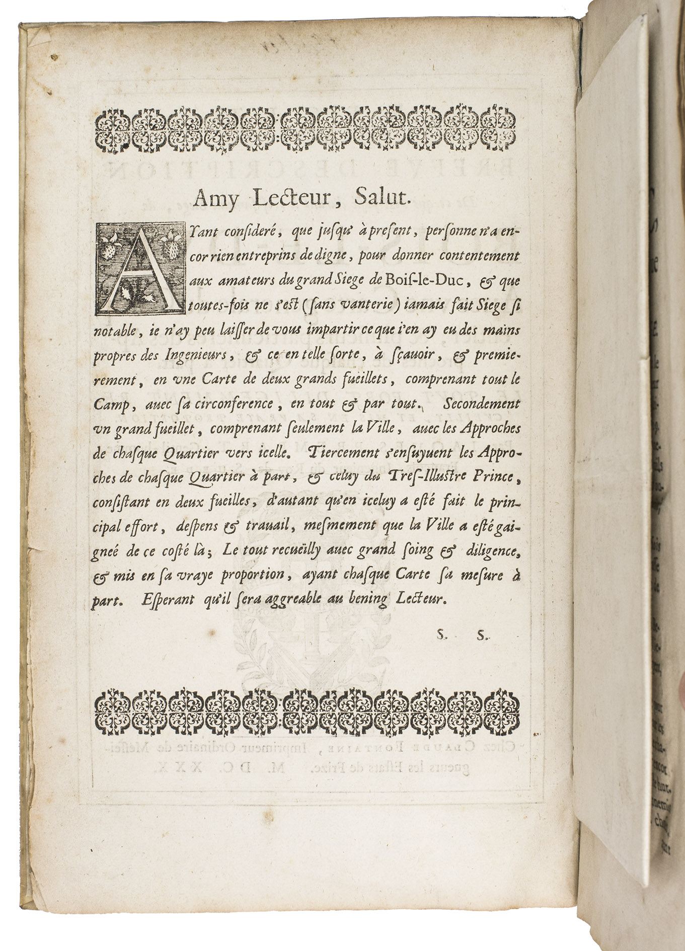 The present work was probably meant as a counterpart to the popular journal by Simon Pelgrom, prior of a monastery at 's Hertogenbosch, relating the happenings within the besieged city, which had been published directly after the events in 1629. Both works became very popular. The present work was also published in a Dutch, English, and German translation in the same year. However, all three editions are now very rare. We have only been able to find three other copies of the present French edition in sales records of the past hundred years.