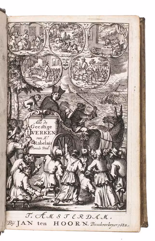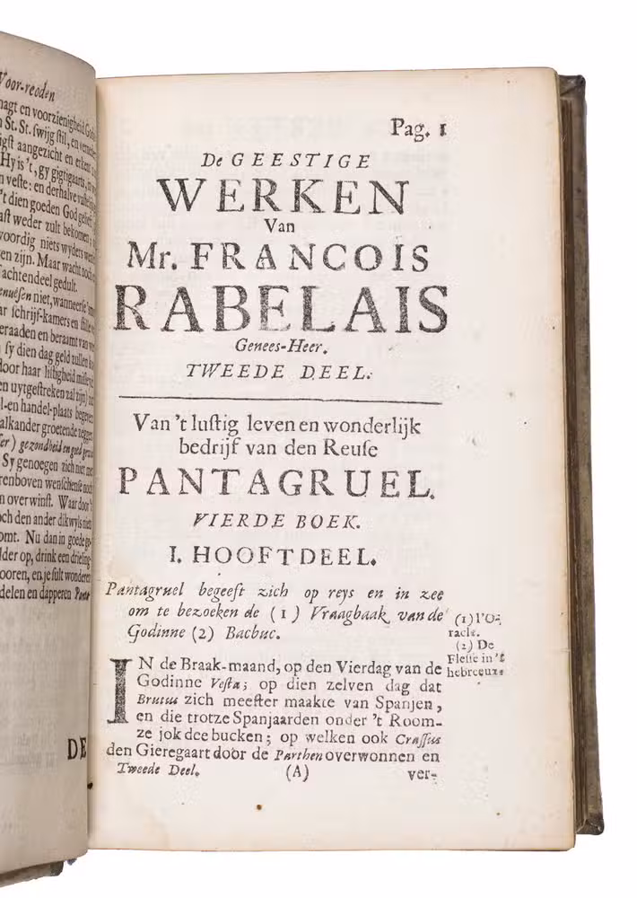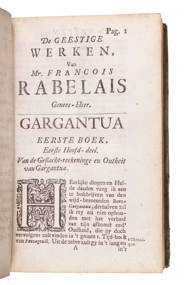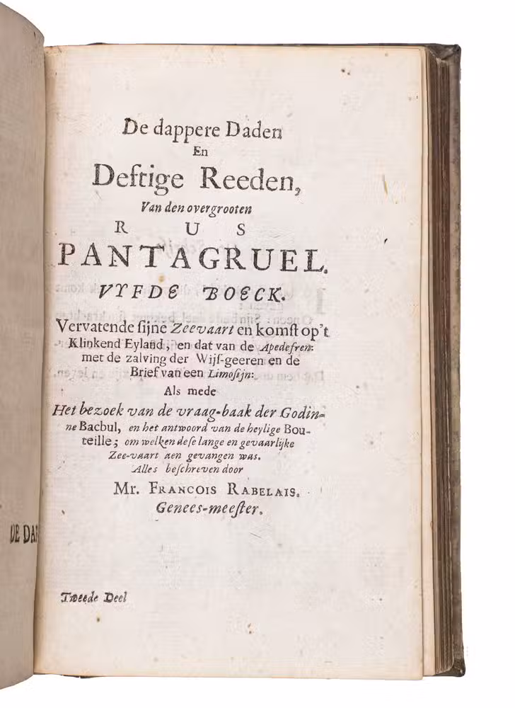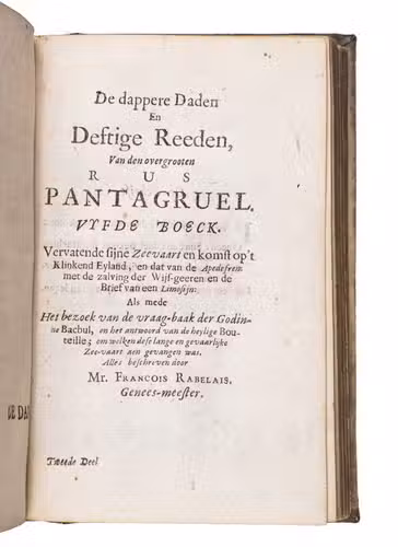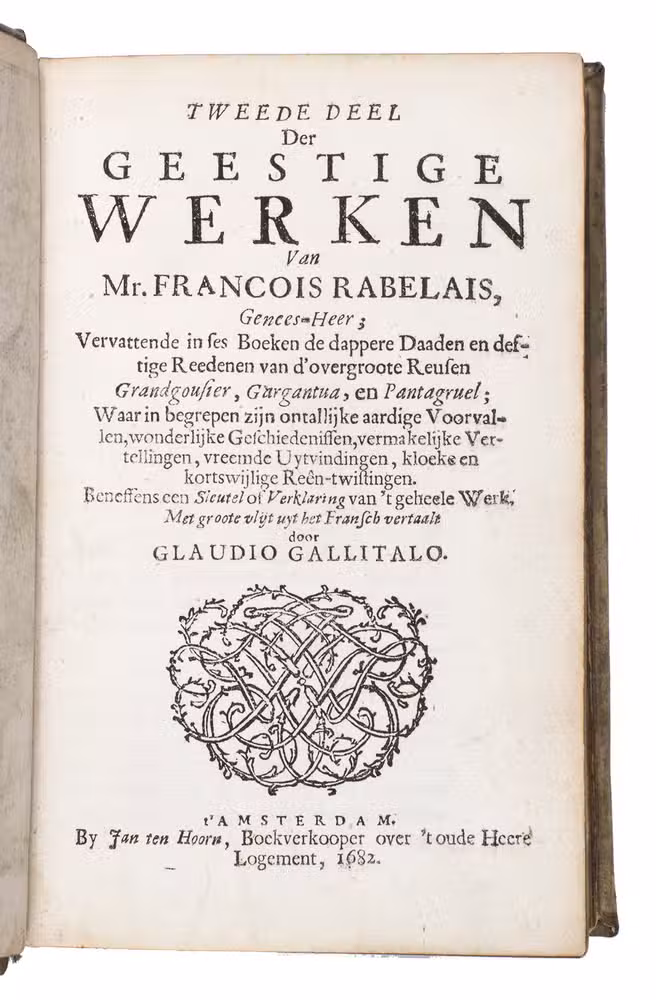 First and only edition of the translation into Dutch of Gargantua and Pantagruel, one of the most comical and at the same time philosophical works ever written. As an admirer of Erasmus, and undoubtedly also inspired by his Praise of folly, the author fights for the Renaissance values in a satirical way with its unique thinking, joking, fantasies and absurdities, criticising the abuses of princes, rulers, and the prelates of the Church, scholasticism and monasticism, and promoting "the real wisdom", and an open and humble Christian faith, certainly not unlike Erasmus. The work was also in its turn influential for Voltaire, Diderot, Sterne e tutti quanti.