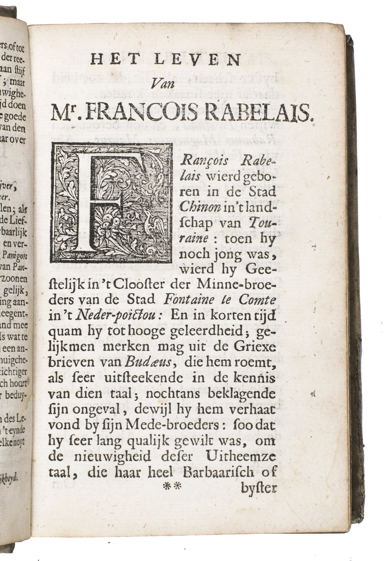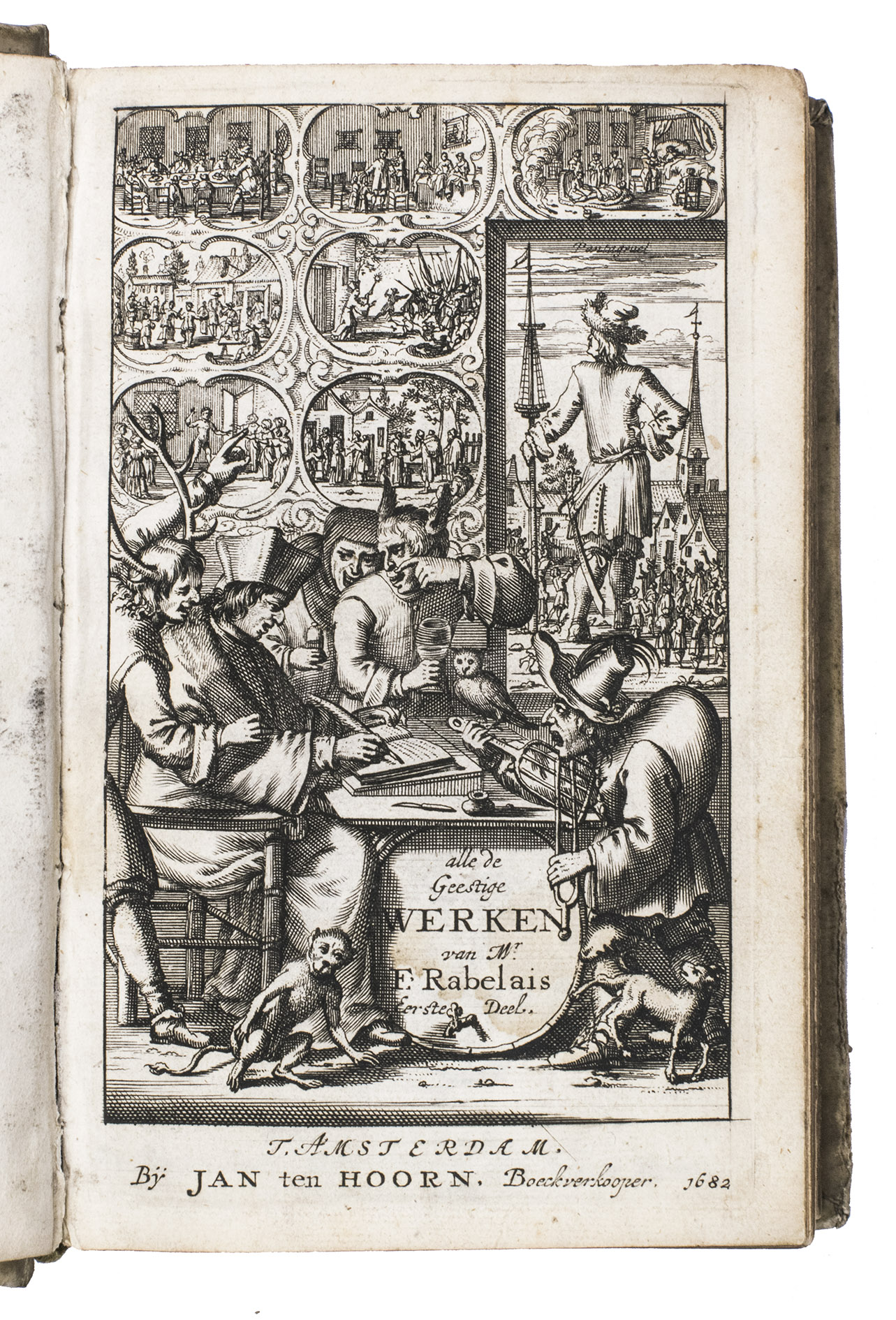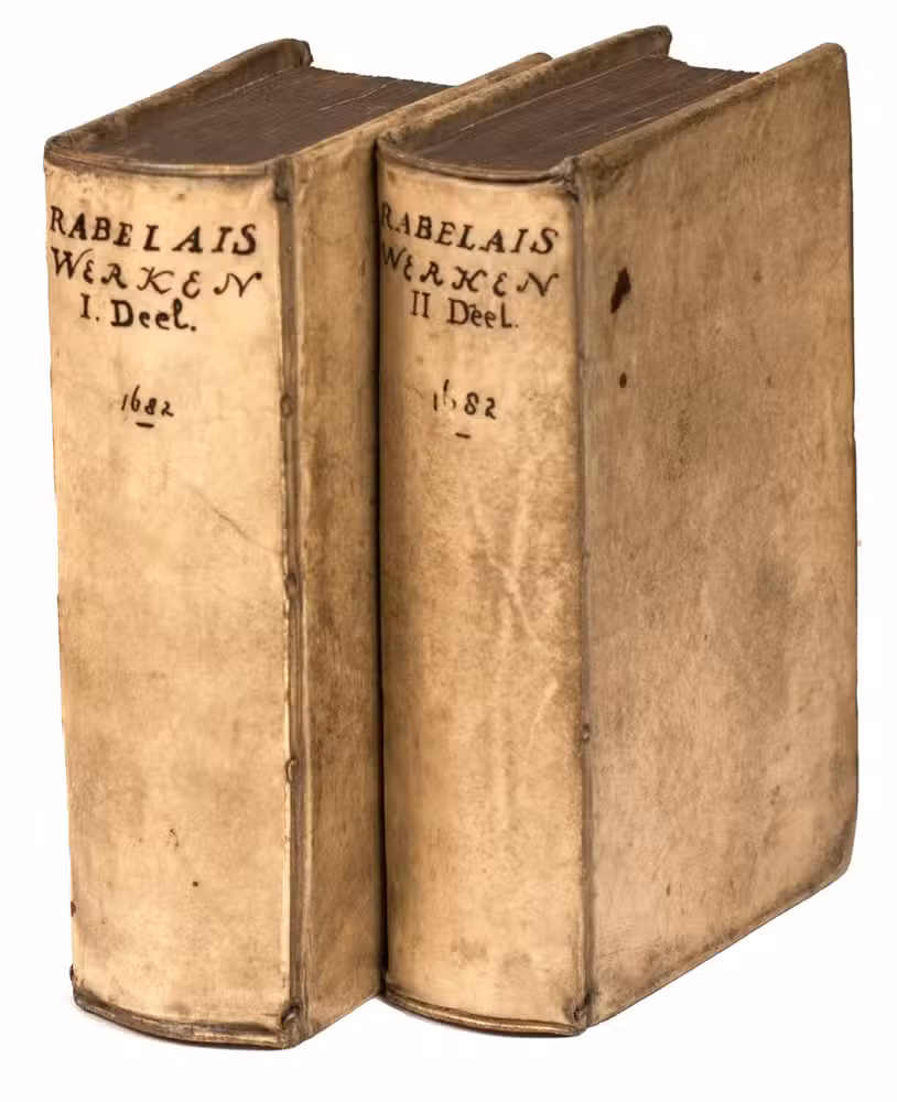 First and only edition of the translation into Dutch of Gargantua and Pantagruel, one of the most comical and at the same time philosophical works ever written. As an admirer of Erasmus, and undoubtedly also inspired by his Praise of folly, the author fights for the Renaissance values in a satirical way with its unique thinking, joking, fantasies and absurdities, criticising the abuses of princes, rulers, and the prelates of the Church, scholasticism and monasticism, and promoting "the real wisdom", and an open and humble Christian faith, certainly not unlike Erasmus. The work was also in its turn influential for Voltaire, Diderot, Sterne e tutti quanti.