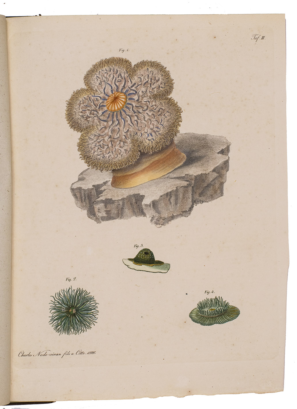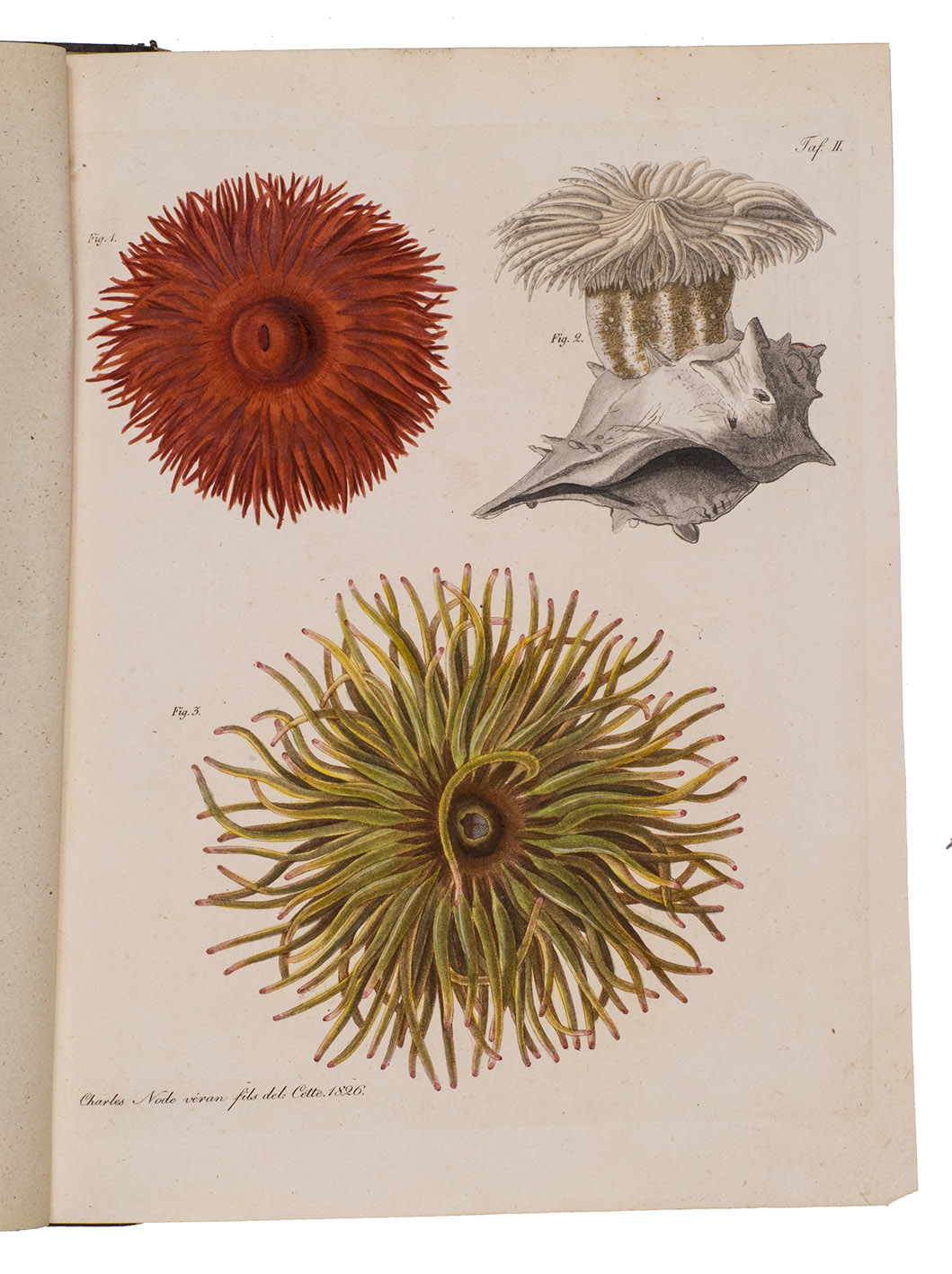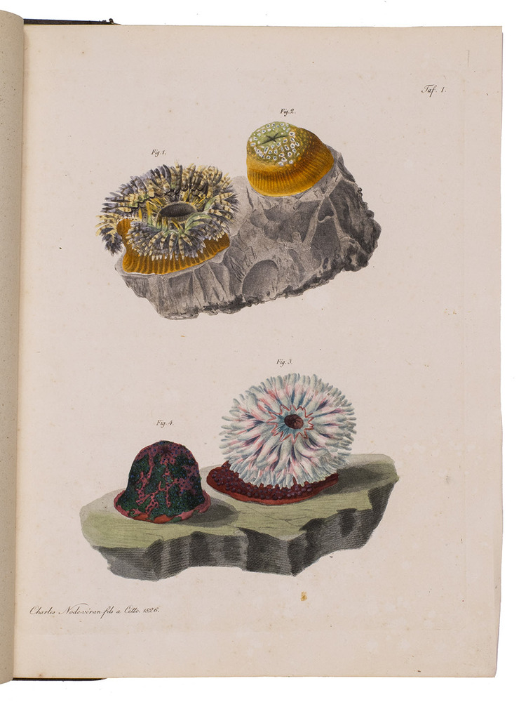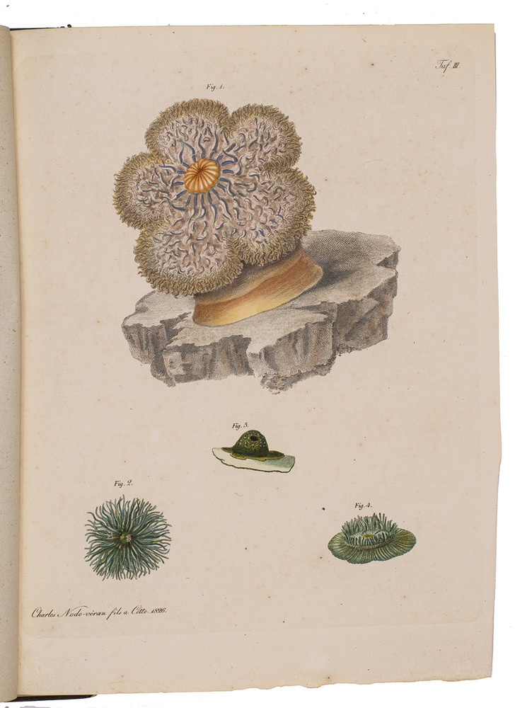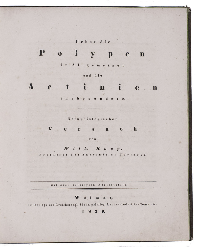 First edition of a work on polyps (coral and sea anemones), and in particular on the genus Actinia (sea anemones), by the German doctor and zoologist Wilhelm Rapp (1794-1868). It opens with a brief preface and an introduction to coral and its classification. The first half of the main text describes different orders and families of coral, both stony and soft coral, including Milleporidae, Pennatulacea, Zoanthus, Madrepora, and more. The second half covers the genus Actinia, with descriptions of 23 different types of anemones, several of which are depicted on the colour plates.