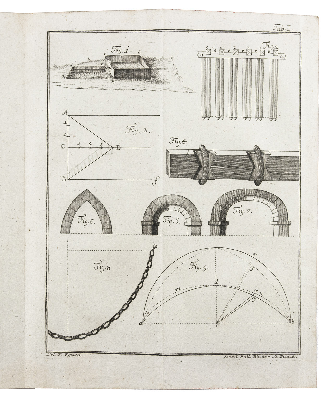 Budapest, Typis Regiae Universitatis, 1779. 2 works in 1 volume. 8vo. With 76 architectural illustrations and figures on 11 folding engraved plates. With: BAUMEISTER, Friedrich Christian. Philosophiae moralis institutiones ius naturae, ethicam, et politicam complexae.