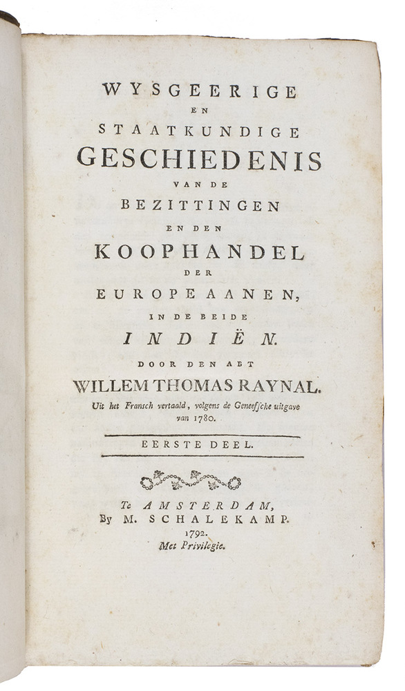 Second copy located, of the second edition of the Dutch translation of an extensive and widely published radical critique of European overseas expansion, written by the French author Guillaume Thomas François Raynal (1713-1796) in collaboration with figures associated with the Encyclopédie, above all the famous French philosopher Denis Diderot (1713-1784). The contents are partly based on travel accounts and data gathered from an unprecedented number of government documents, furnished by a network of officials and informants in all the colonial powers.