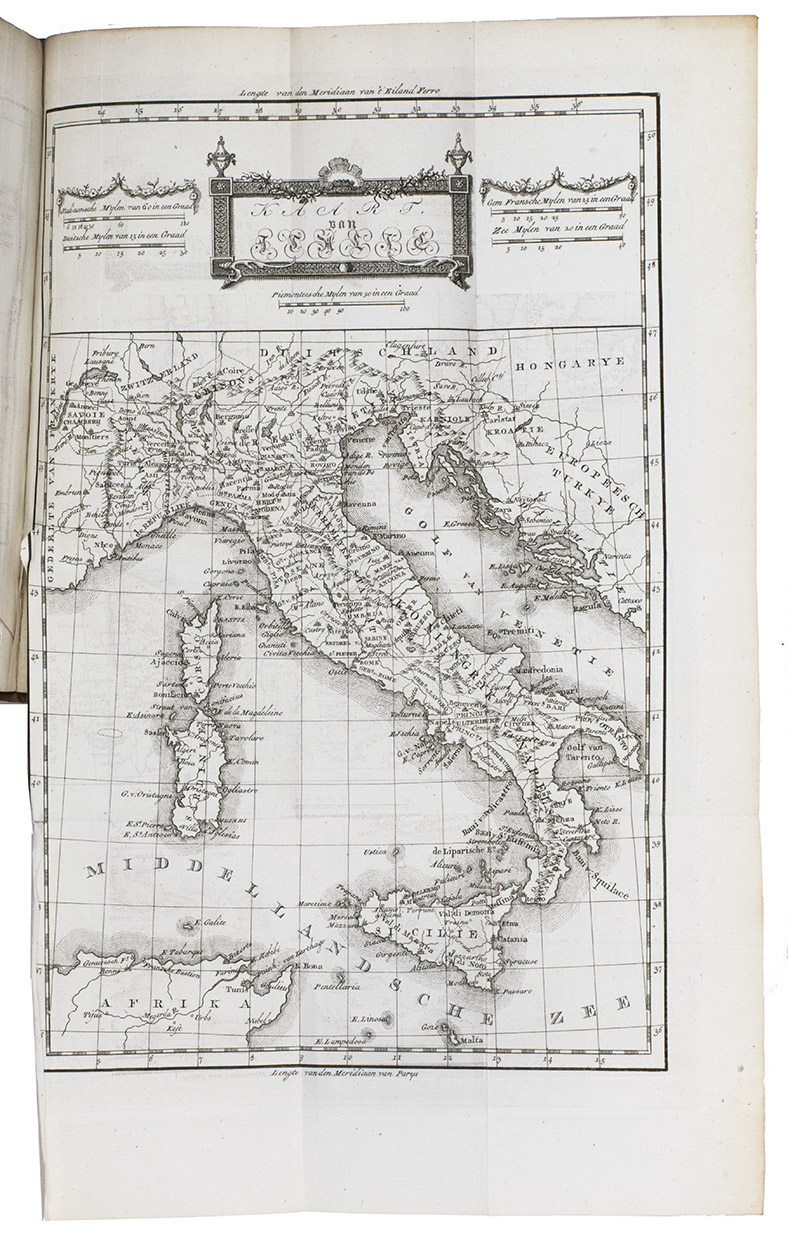 Amsterdam, Matthijs Schalekamp, 1792-1803. 10 volumes bound as 9. 8vo. With 2 different engraved author's portraits, 8 engraved plates (5 as frontispieces), 12 engraved folding maps and 23 letterpress folding tables. Contemporary half calf, gold-tooled spine. VI, [4], 469, [19]; [8], 533, [1 blank], 11, [1 blank]; [8], 508, [11], [1 blank]; [8], 427, [9], [2 blank]; [8], 365, [9]; [8], 426, [10]; [10], 501, [7]; [8], 458, [11], [1 blank]; [8], 339, [10], [1 blank]; [4], 432, [13], [1 blank] pp.