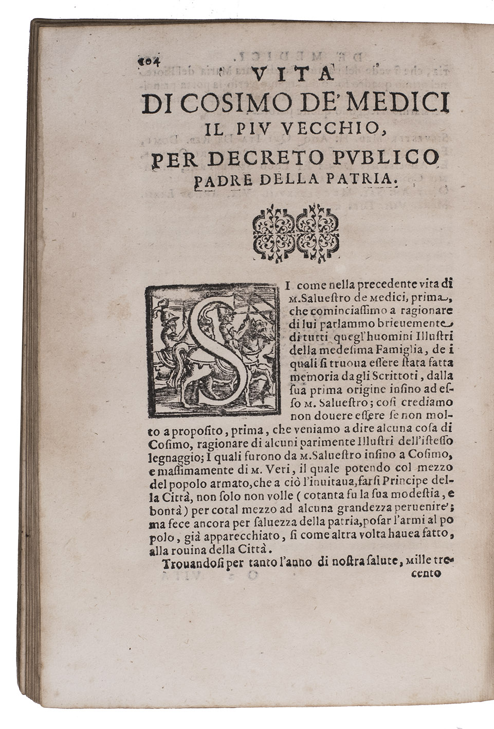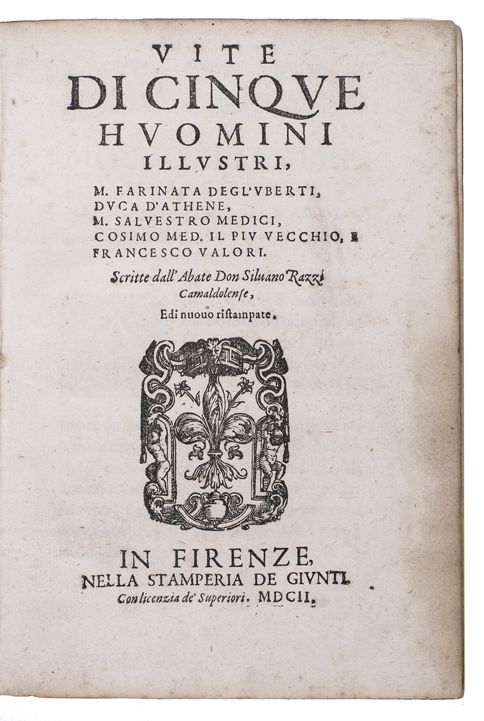 Biographies of five "illustrious men", all known primarily for their positions of power in Florentine politics, in the original Italian, by Silvano Razzi (1527-1611). Valori was added for the first time in the present second edition. Razzi's selection is interesting for including people whose power proved short-lived or who worked largely behind the scenes: all five changed the course of Florence's history with important long-term consequences, but only Cosimo de' Medici is a household name.