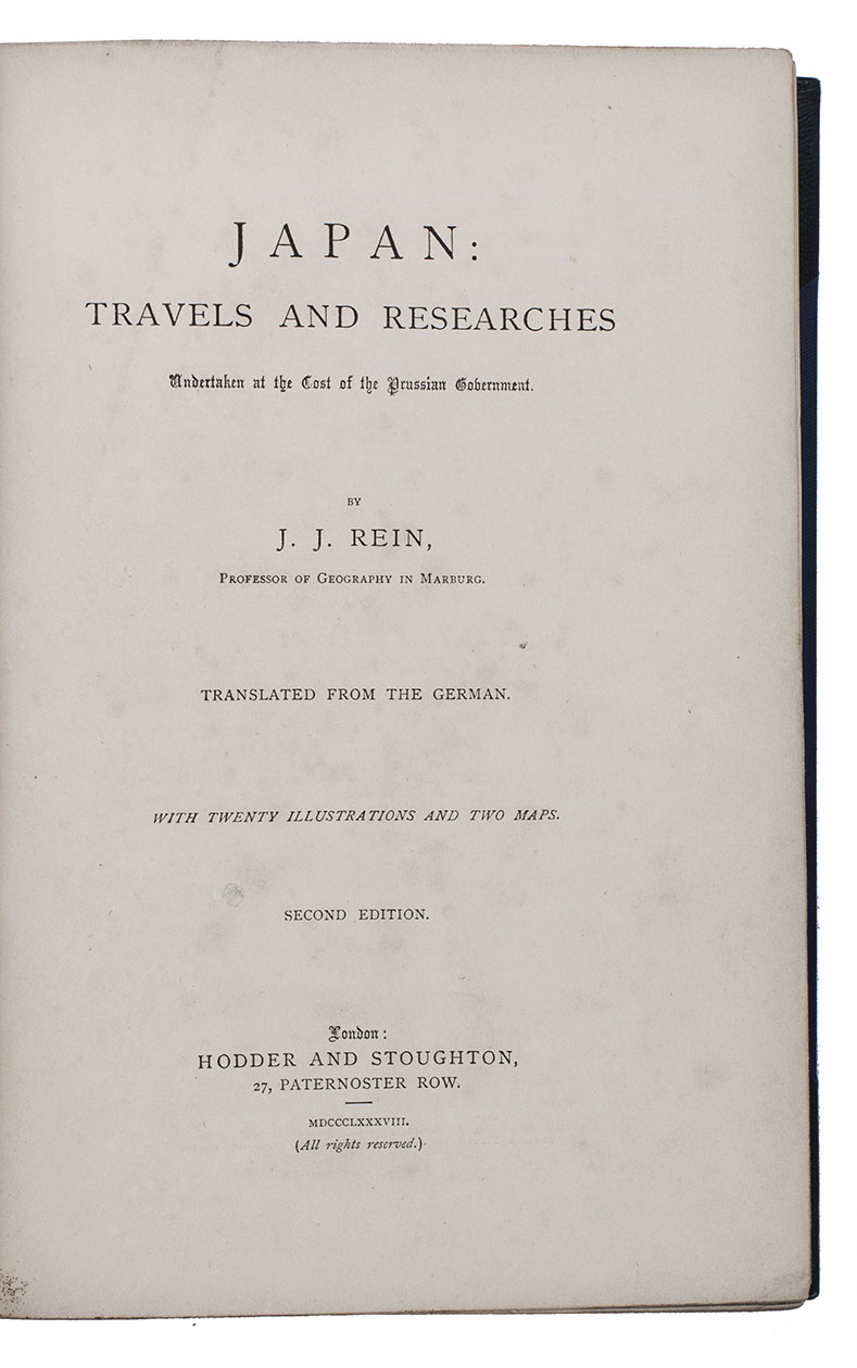 Second edition of the English translation of a history of Japan by the German geographer Johannes Justus Rein (1835-1918). Rein made various travels in Europe, America and Asia, and wrote several works about his research there. This work starts with a detailed description of the physical geography and the natural history of Japan: covering the volcanoes, climate, islands, mountains, flora, fauna and more. The second part deals with the history and the people, including the different shogunates, costumes, customs, art and architecture, etc.The first edition of the English translation appeared in 1884. The German original Japan nach Reisen und Studien im Auftrage der Königlich Preussischen Regierung dargestellt, was first published in 1881. A second volume to the German edition appeared in 1886.