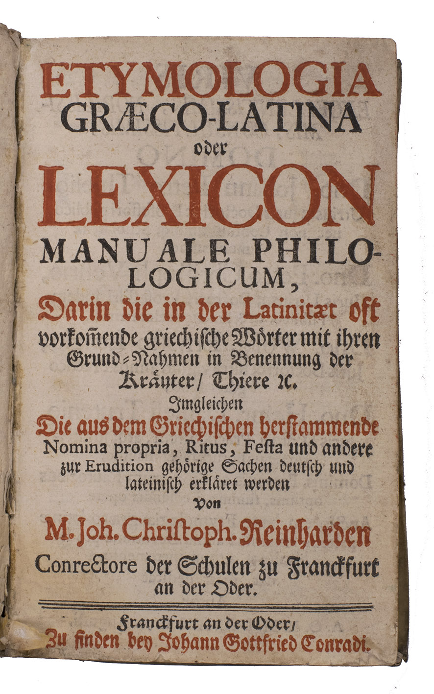 Very rare first and only(?) edition of a Greek/Latin-German lexicon, compiled by Johann Christoph Reinhard and intended for the use at schools in Frankfurt an der Oder, Brandenburg. It alphabetically list numerous Latin and Greek words, followed by a German translation or explanation. The second part focusses on words frequently used by physicians, surgeons, notaries and merchants.