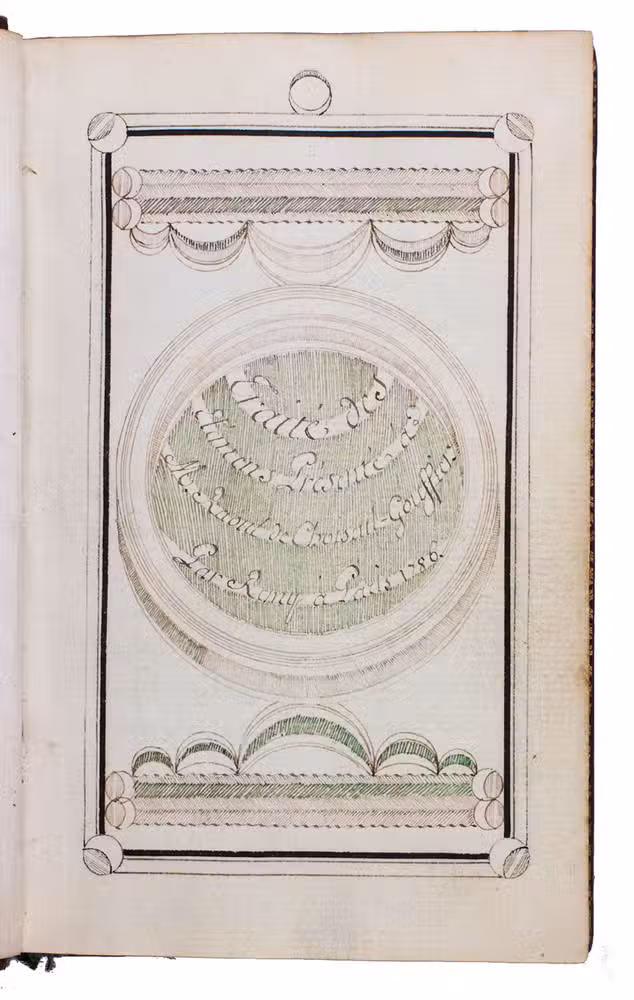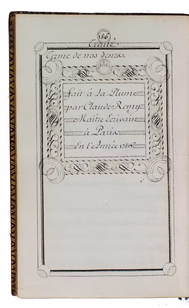 Beautiful calligraphic manuscript by Claude Remy, writing master and tutor of the children of the Paris beau monde for more than a decade before the French Revolution. The author-calligrapher notes in an epilogue that he had executed more than 60 similar instructive manuscripts, not only for his pupils but also for their parents, who greatly valued them, but few have survived. Remy executed it for and presented to Raoul de Choiseul-Gouffier, the young son of Gabriel Auguste, Comte de Choiseul-Gouffier (1752-1817), author of Voyage pittoresque en Grèce, who served as French ambassador to the Ottoman Empire from 1784 to the French Revolution, then fled to Russia in 1793 where he served Catharine the Great and her successors as Imperial Librarian and director of the Imperial Academy of Arts at Saint Petersburg. He returned to France in 1802, when the Treaty of Amiens brought temporary peace. Raoul became head of the Russian branch of the Knights of Malta and appears to have succeeded his father as count in 1817.