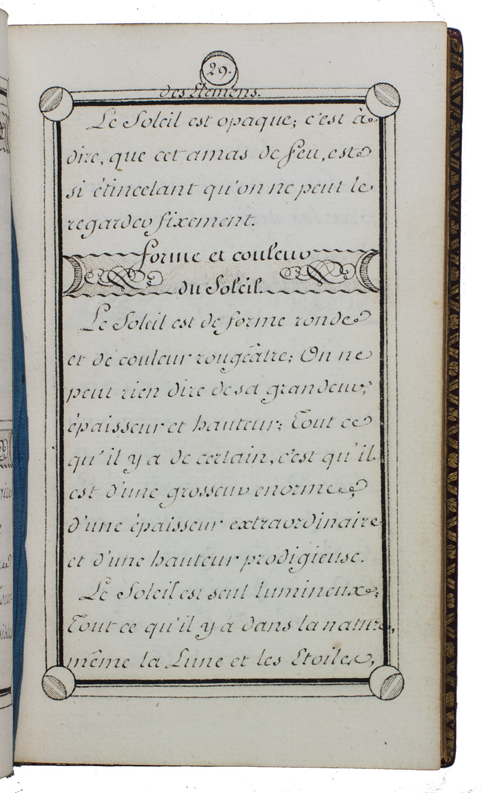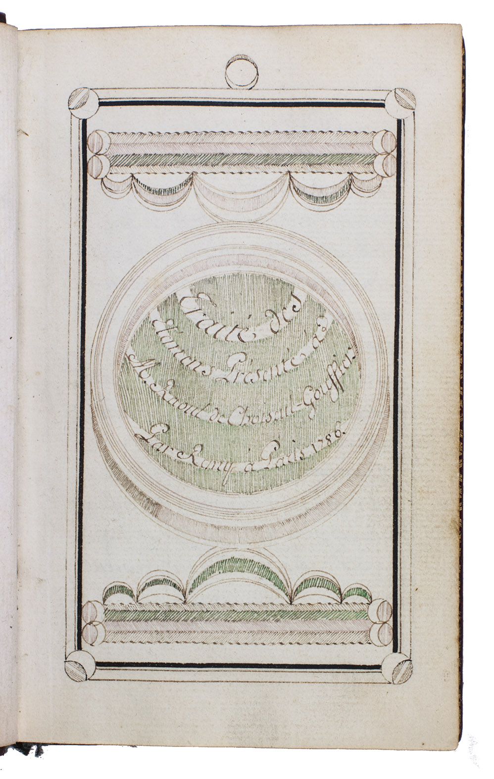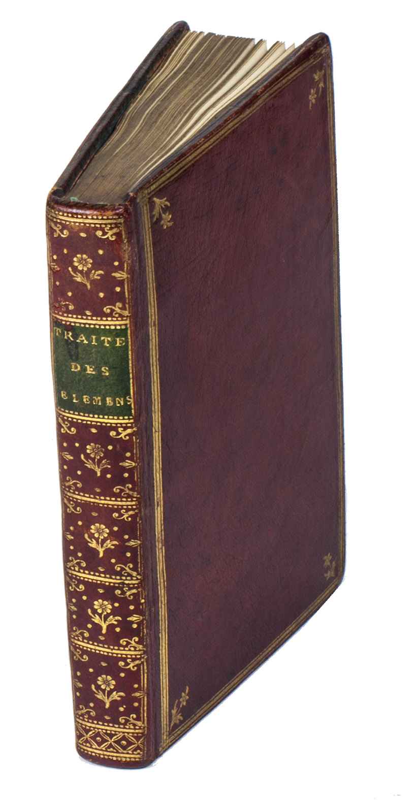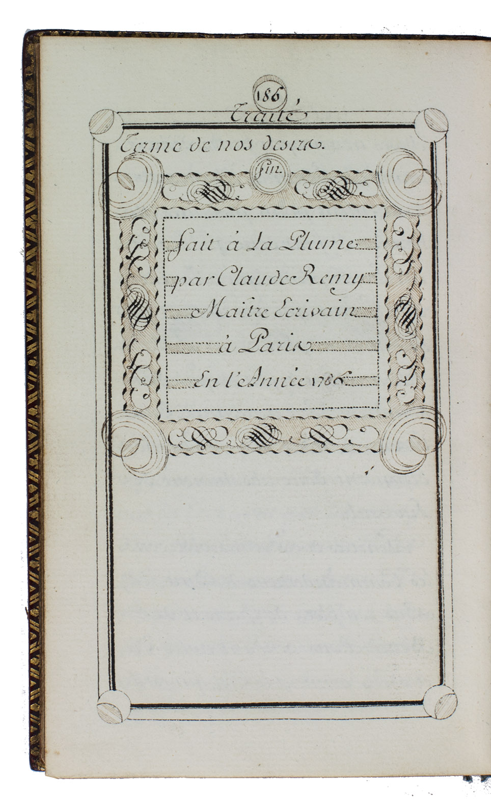 Paris, 1786. Small 8vo. Calligraphic manuscript written in French in dark brown ink on paper, in a formal Latin script hand (a French-style "batard"), with an ornamental, calligraphic title page in reddish brown, green, dark brown and black ink, each page in a thick-thin-thin border with circular decorations in each corner and centred at the head, running heads in the border, the heading of the "Avertissement" in a decorative script, and calligraphic chapter headings in circular or rectangular decorations and sub-headings in decorated horizontal bands. Contemporary red, gold-tooled morocco, the smooth spine divided into 6 panels (separated by lines flanked by dotted lines), the 2nd with a dark green title-label, each of the others with an 8-petalled flower, 10 dots, a decoration in each corner and another at each side, and a decorated band at the foot; each board with a border of thin-thick-thin fillets with a decoration stamped on each corner and a 6-petalled flower inside each corner; gold-tooled turn-ins, gold fillets on the board edges (altogether about 130 impressions of 13 tools), gilt edges. [2], 186, [4] pp.