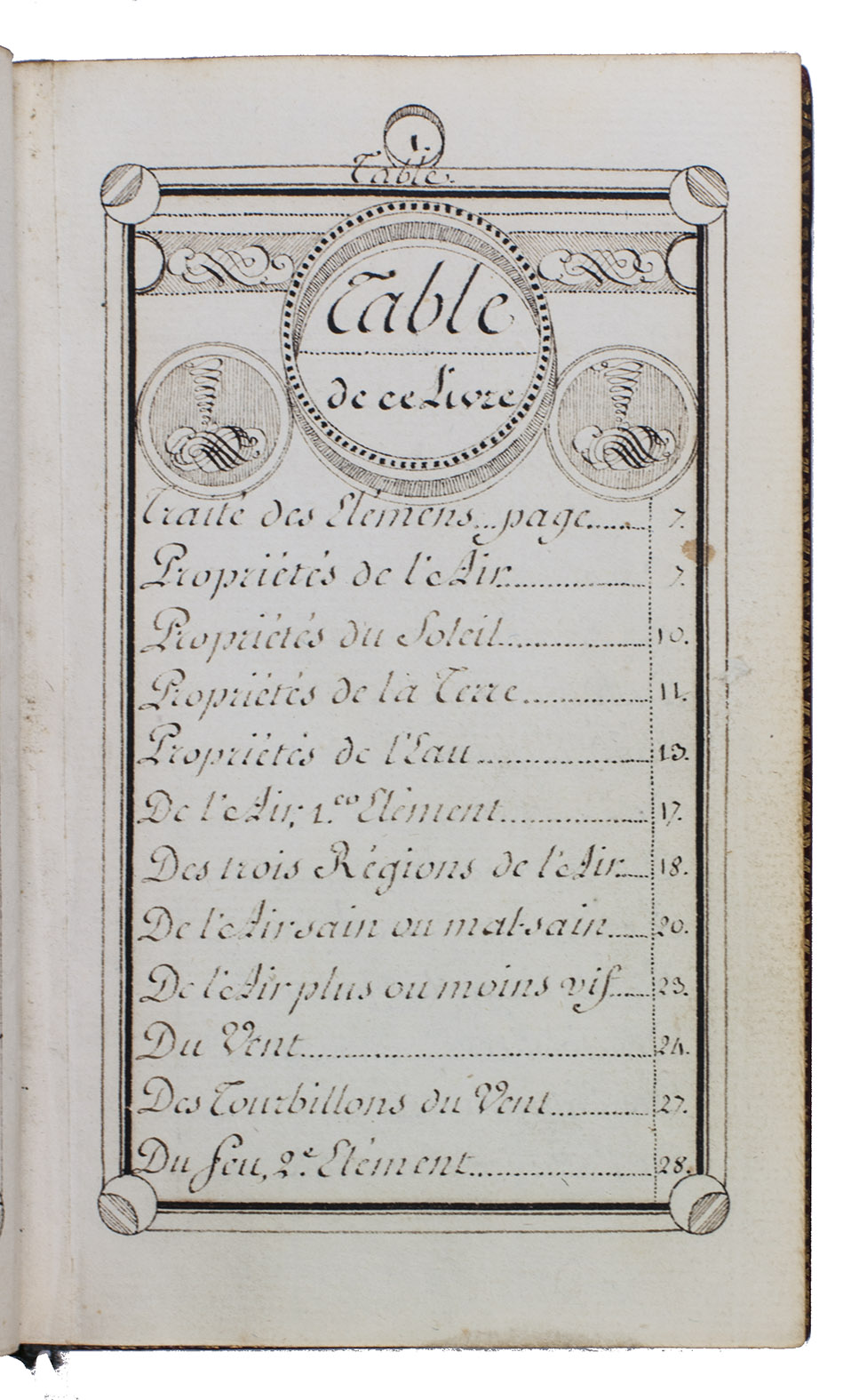 Remy's "avertissement" notes that he taught not only writing, but also reading, arithmetic, Latin, geography and several other subjects, but that he especially loved to teach the science of the four elements, the principal subject of the present manuscript. It clearly and methodically presents the traditional scientific ideas about air, fire, water and earth, including chapters on the properties of the elements, wind, hurricanes, the moon, the sun, heat, clouds, different climates, the tropics, the continents, the poles, oceans, bays, islands, rivers, floods, eclipses, the products of the earth, bodies, blood, senses, spirit, perspective and geography, even straying to topics such as the church, nobility, government, finances, commerce, artisans, wealth, poverty, education and the existence of God. The 6-page table of contents lists nearly a hundred topics covered. Two earlier Remy manuscripts of his Traité des quatre elémens are known, also executed for leading families in Paris.