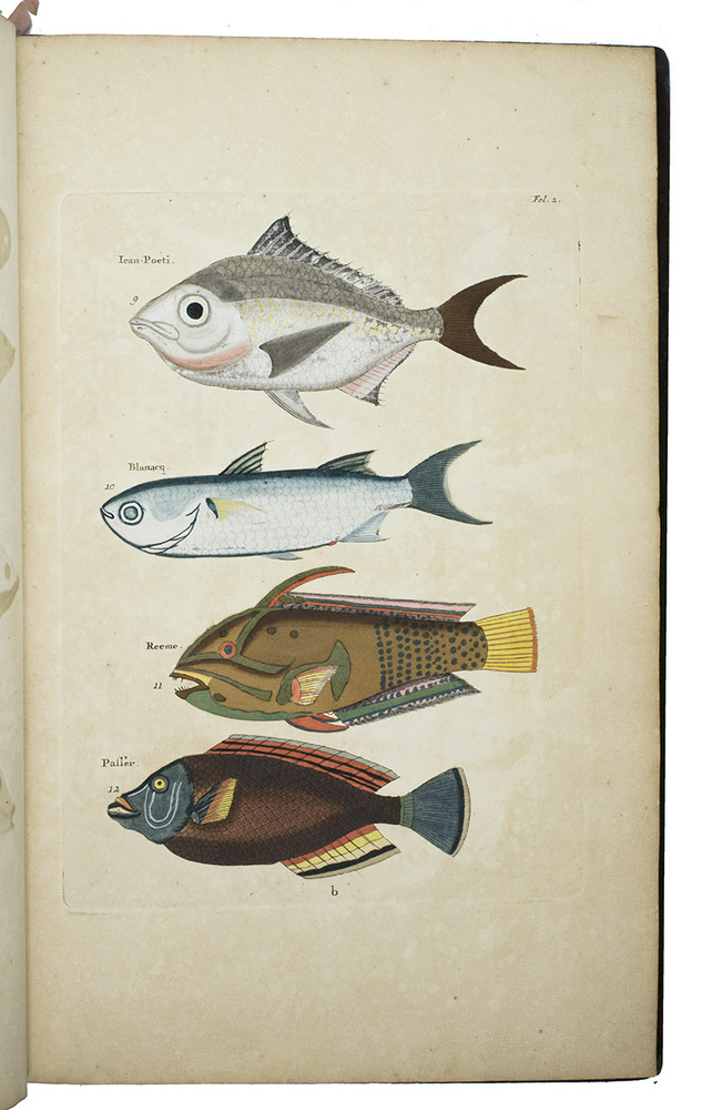 Renard's famous but rare work, noted for the spectacular imagery of colourful but also bizarre tropical fishes, crabs and lobsters from the Indo-Pacific, being the first colour-plated fish book, here in its rare second edition. The book contains 100 plates with 460 originally and extraordinary hand-coloured copper engravings, divided over two volumes with their own half-title ('Histoire naturelle des plus rare curiositez de la mer des Indes'), of 415 fishes, 41 crustaceans, two stick insects, a dugong and even a mermaid, all living in the Indian Ocean between the East Indies. Sometimes the descriptions specifically refer to fishes of some islands in the East Indies, as Ambon, the Moluccas or Buton, but they also contain references to the "fishes of the Antilles, Brazil" (Sabin) and Mauritius. The illustrations in the first volume seems to be quite realistic, in contrast to those in the second volume, which are sometimes quite surreal, which is even more emphasized by the short anecdotical and highly entertaining descriptions.