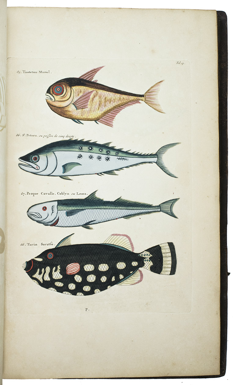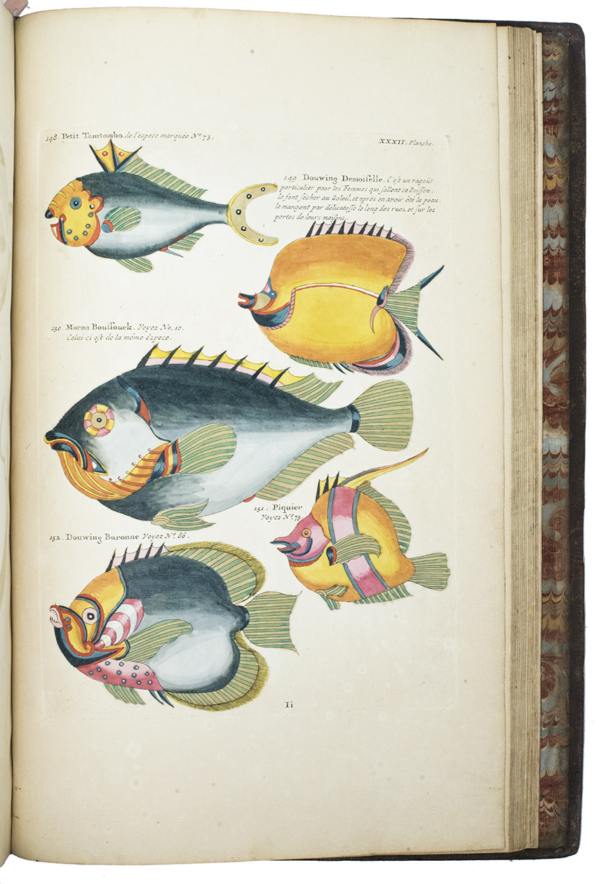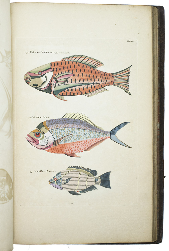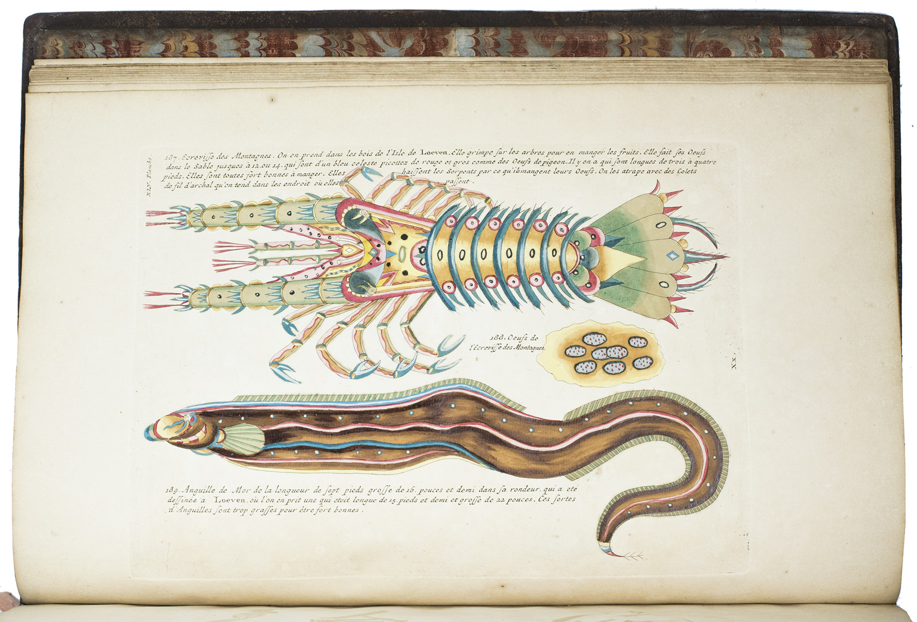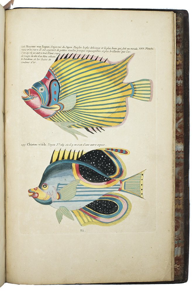 Amsterdam, Reinier & Josua Ottens, 1754. 2 volumes bound as 1. Folio. Title-page in red and black, a divisional-title for each volume and 100 engraved plates, vividly hand-coloured as published, showing 460 fishes and other marine animals. Contemporary calf, richly-gold tooled spine and bords, green morocco spine label with title in gold, decorated edges, marbled endpapers. Preserved in a professionally made black cloth box. [7] ll., 43 plates; [1] leaf, LVII plates, [4] ll.