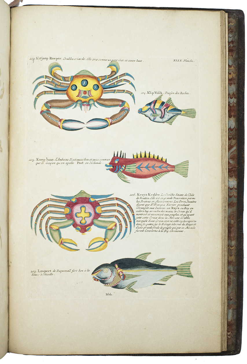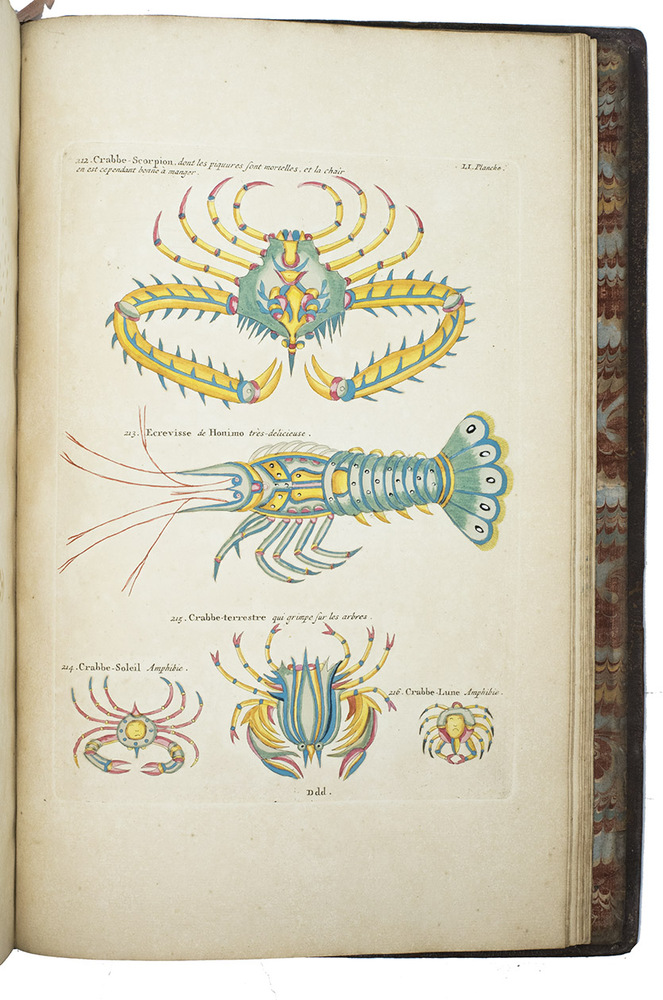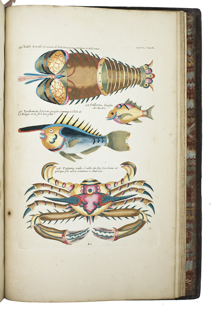 The book shows marine life in the East Indies and the Indo-Pacific when Europe knew very little on this subject there. Because of the brilliant colours, fantastic shapes and the described habits of its subjects, the work, however, was often dismissed in its own time as fantasy. Nevertheless Renard's Poissons ecrevisses et crabes is nowadays still one of the rarest and most magnificent ichtyological works, being the first colour-plated fish book and a highly interesting scientific effort to represent the Indo-Pacific maritime life, mixed with flights of fantasy.