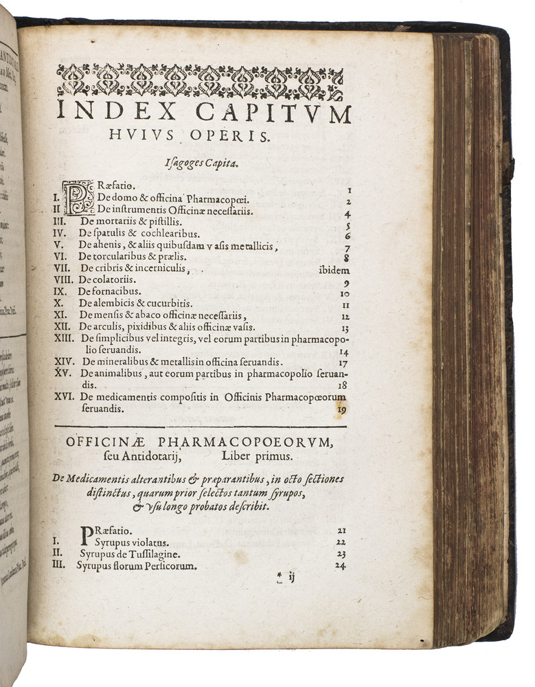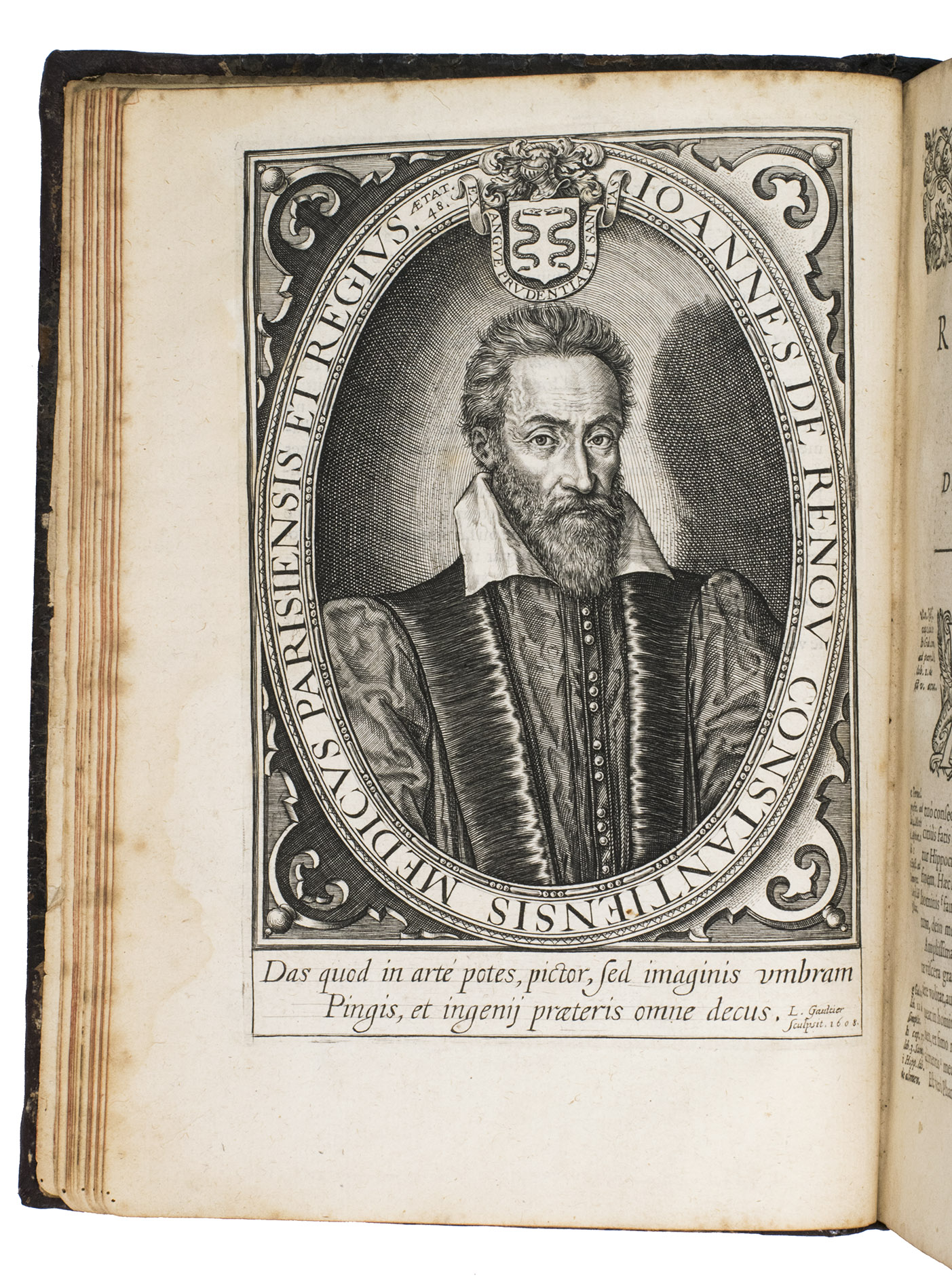 First edition of a comprehensive and influential medical work, written by the Parisian physician Jean de Renou (1568-1620). "Of particular influence on the practice of French pharmacy were the writings of Jean de Renou (1608), providing a formulary, a textbook, and a guide to the preservation of drugs, the use of pharmaceutical equipment and to the rules of professional ethics" (Sonnedecker). The work is divided into two parts, each with its own engraved part-title. The first part starts with some general chapters on the principles of pharmacology and what a proper apothecary is like. Several chapters follow on different types of medicines, their characteristics, how to compound them and when to prescribe them. Three large chapters cover the different ingredients and their medicinal powers, distinguishing between plants, minerals and parts of animals. Whereas the first part is more introductory and informative, the second part is more like a pharmacopoeia. It gives many recipes for medicines, with comments on the diseases or ailments they're supposed to cure.