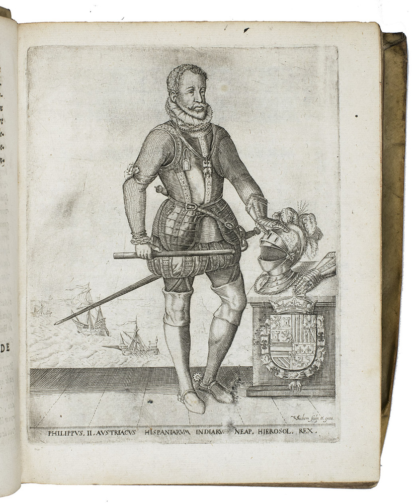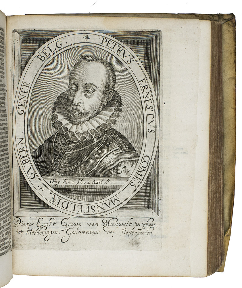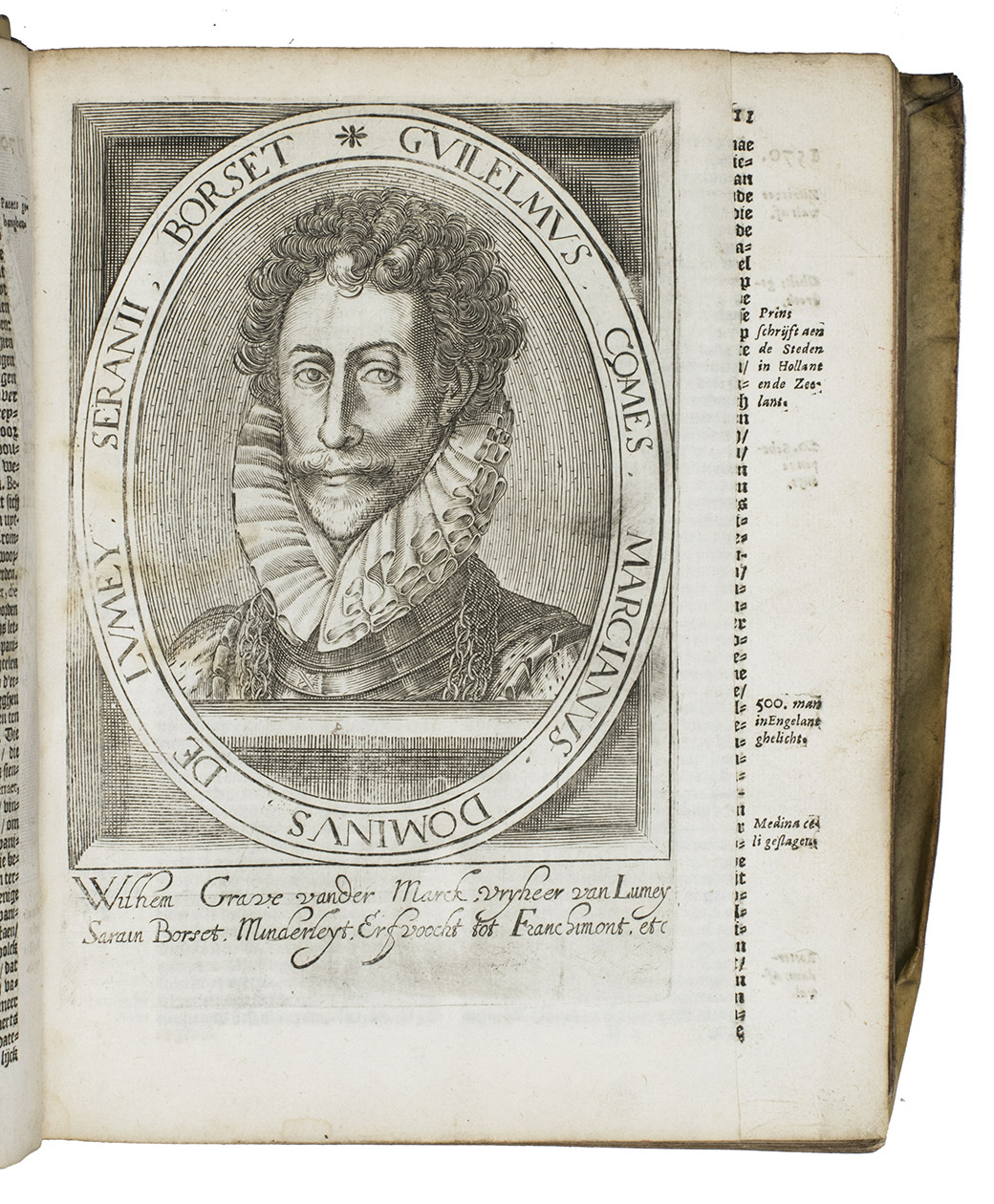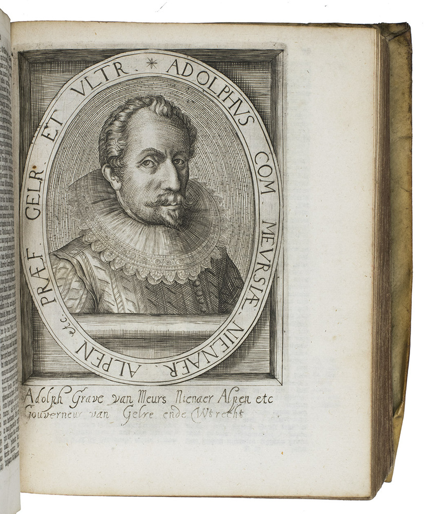 Extensive historical treatise on the first years of the Eighty Years War between Spain and the Low Countries by Everhart van Reyd, with beautifully engraved portraits of important historical figures like Philip II, king of Spain, Ferdinand Alvarez, duke of Alva, William, prince of Orange, and Maurice, prince of Orange. Some of the portraits were also used in E. van Meteren's Niederländische Historien (Antwerp, 1611), and also in the Dutch editions of the same work (Amst., 1647, 1652, 1663). The first portrait, by J. Muller, with a Latin verse of J.J. Pontanus underneath, shows the author at the age of 52.