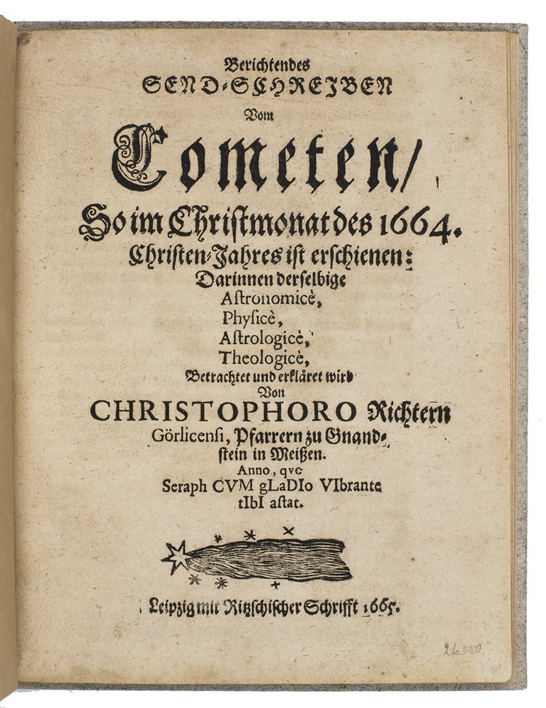 First and only edition of this rare pamphlet on the great comet of November 1664. The comet was immensely bright and resulted in one of the first scientific debates on an international scale, as astronomers formed international networks to exchange their data on the comet's trajectory. In the present work, the astronomical, theological and astrological implications of the appearance of the comet are discussed at great length by Christoph Richter (1618-1680), a protestant minister in Gnandstein in Meisssen. The text is dated 27 December 1664. This year is concealed in a chronogram on the title ("Anno, quo Seraph CVM gLaDIo VIbrante tIbI astat").