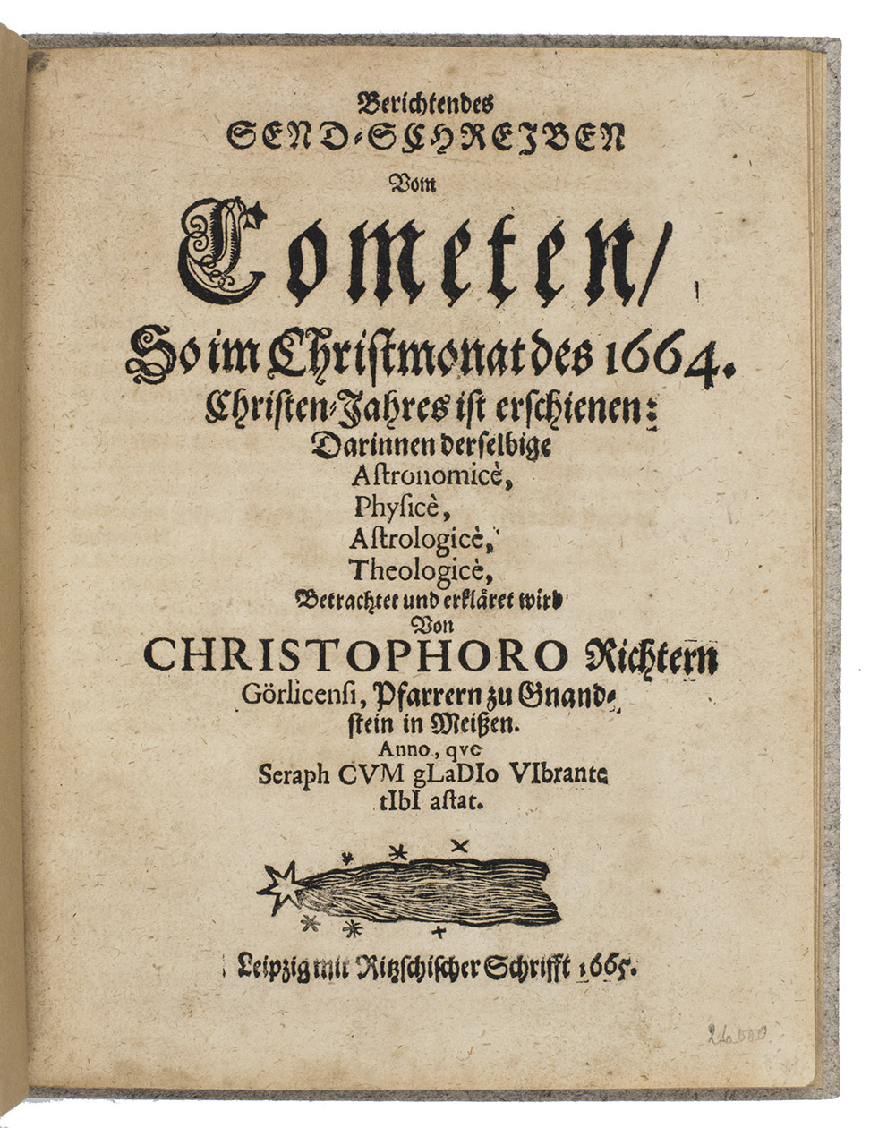 Leipzig, Ritzsch, 1665. 4to. With a woodcut illustration of a comet on the title-page. Modern grey boards. [12] ll.