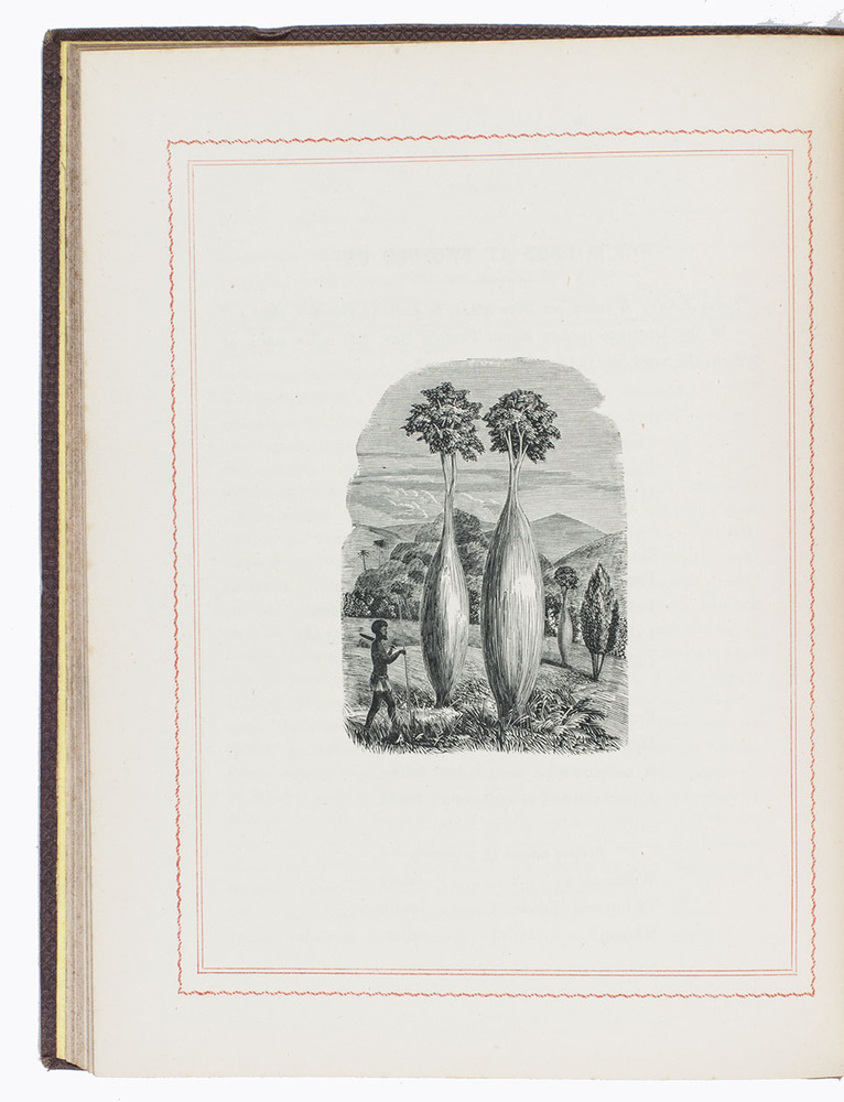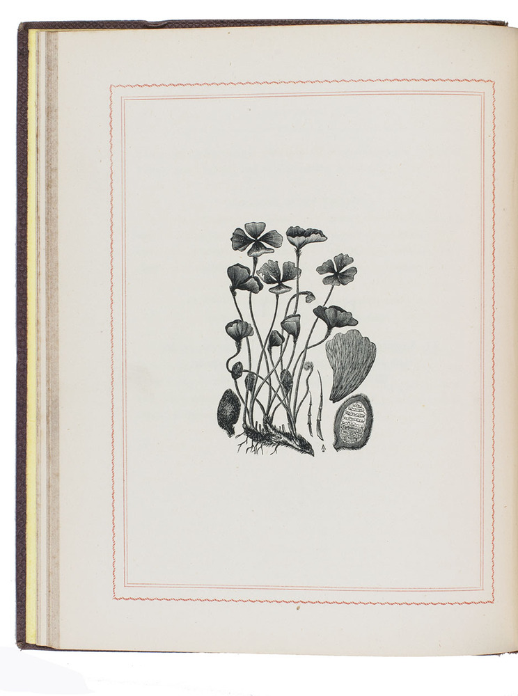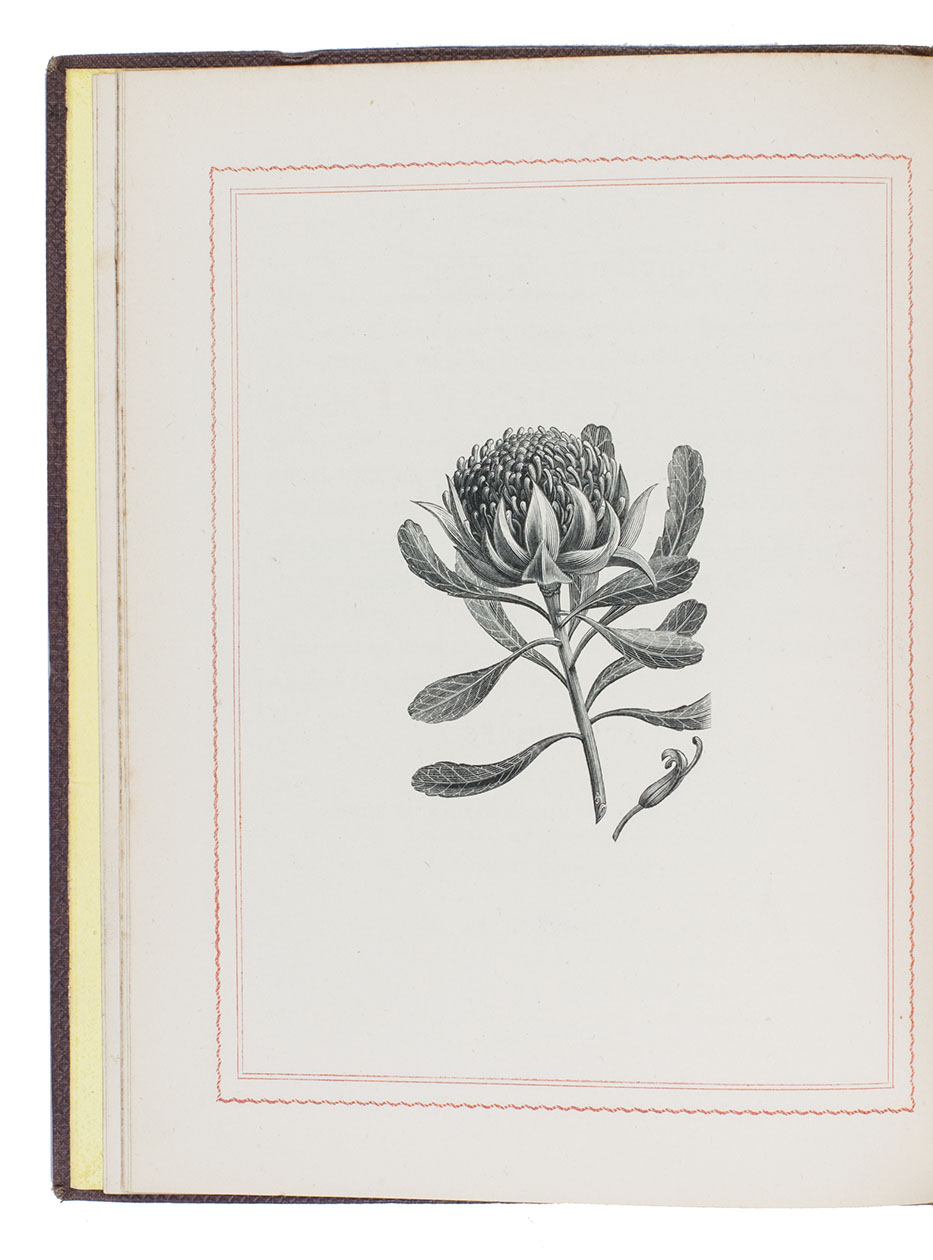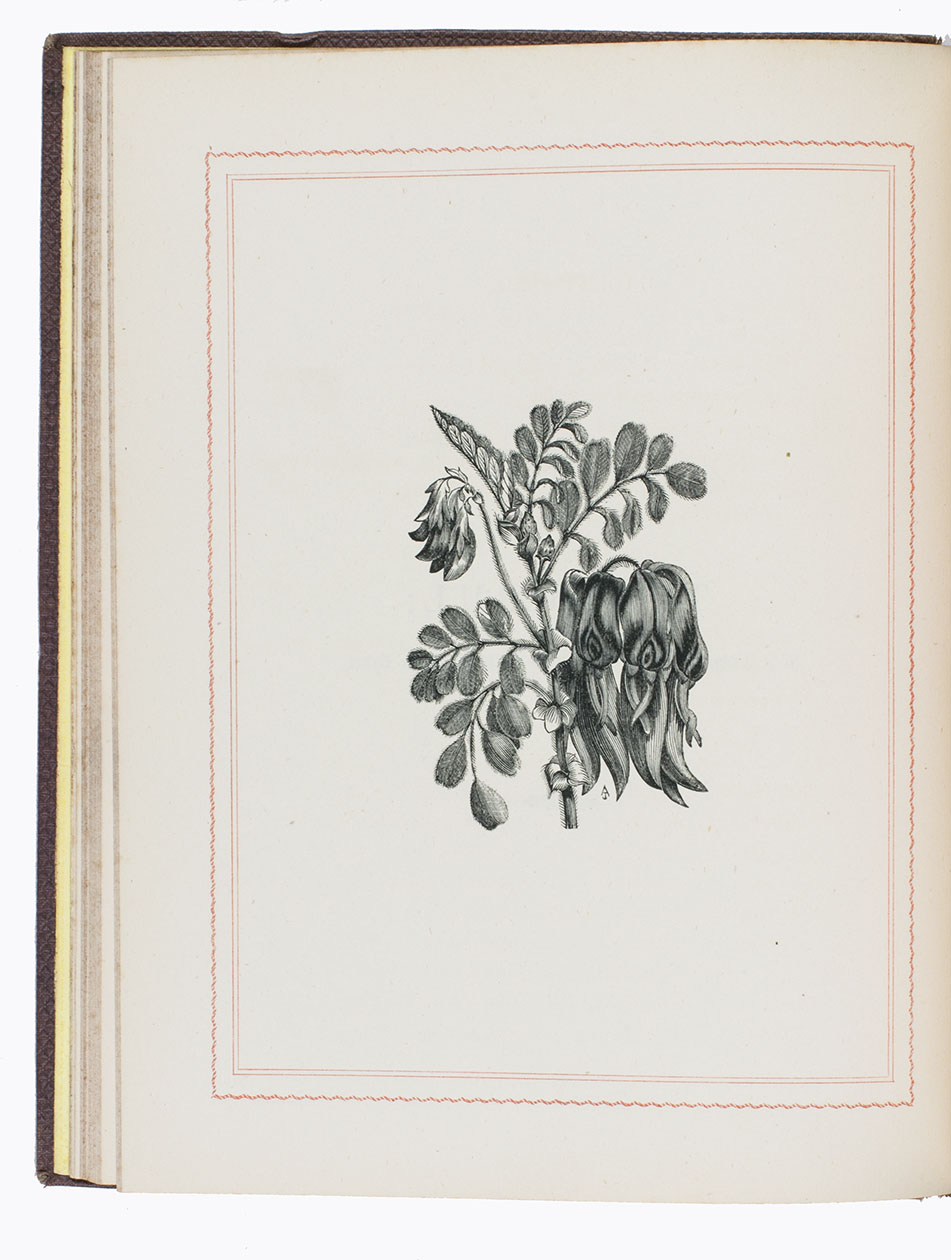 Sydney, Thomas Richards (New South Wales government printer), 1866. 4to. With an armorial vignette printed in several colours and gold (the unofficial "Advance Australia" Australian coat of arms), 4 fine full-page wood engravings of plants and flowers. Original publisher's maroon textured cloth. VI, 88, [2] pp.