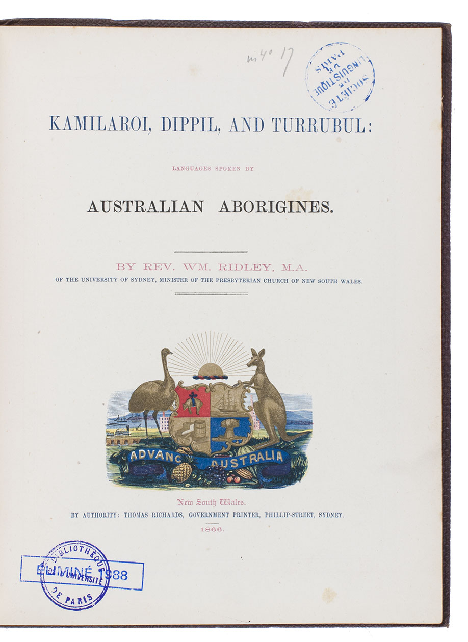 First edition of grammars and vocabularies for three languages spoken by Australian Aborigines, compiled by William Ridley, professor at Sydney University and Minister of the Presbyterian Church of New South Wales. Ridley (1819-1878), an English missionary, came to Sydney in 1850. He wished to learn these languages in order to teach the Aborigines and carry out missionary work among them. Since the Aborigines had no written language, the present book forms a primary source for the languages as they existed more than 150 years ago, when they had had less contact with the Western world. He writes that he found these Aboriginal languages to posses a remarkable regularity and exactness, and that they "indicate an accuracy of thought, and a force of expression, surpassing all that is commonly supposed to be attainable by a savage race". In 1866 that was a remarkably progressive notion. He also adds some notes on Aboriginal names and customs. The book is nicely produced, with lovely wood engravings and interesting as an early example of Australian colour printing. The coat of arms is much like the earliest one known, which dates from 1821, but the third quarter shows a barrel and other goods rather than a harpoon and anchor.