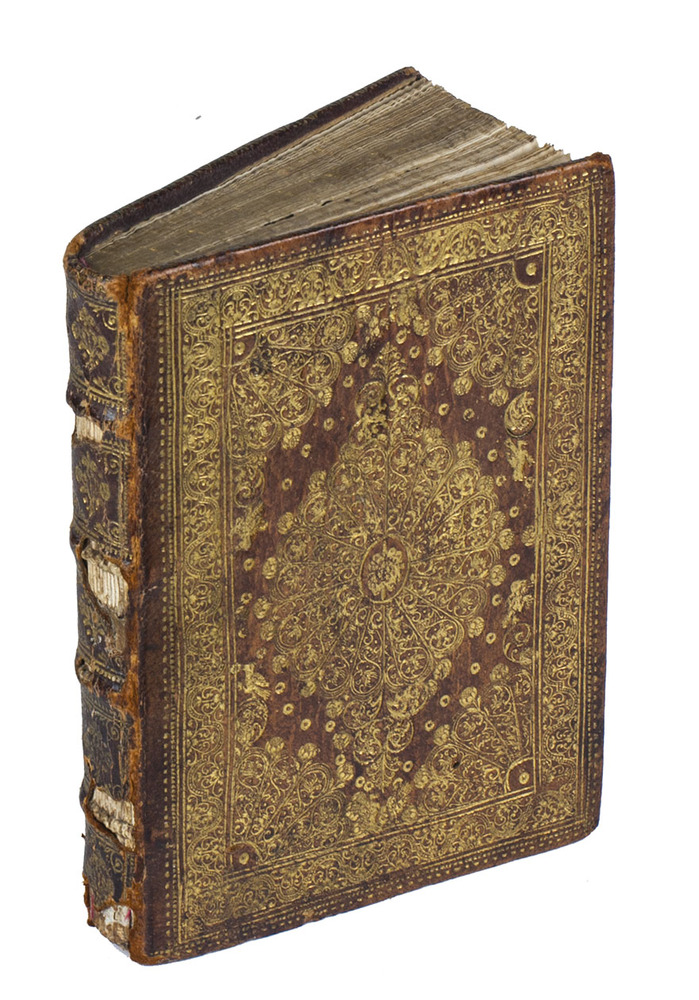 Lisboa, Bernardo da Costa Carvalmo for Joseph da Cruz Cardozo, 1708. 2 parts in 1 volume. 8vo. With a general title-page with a woodcut portrait of a monk (in the centre of a large rosette) and a divisional title-page for the second part of the tex. Contemporary richly gold-tooled calf, gold-tooled board edges, gilt and gauffered edges. [14], 54, [1], [1 blank], 55-237, [3 blank] pp.