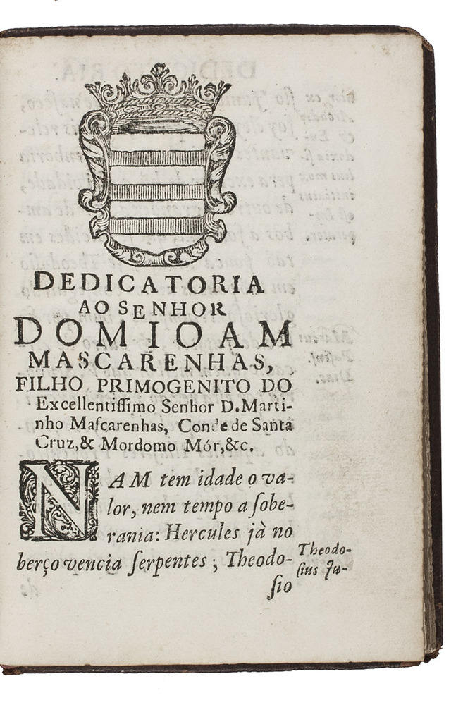 The Lisbon bookseller and publisher Joseph da Cruz Cardozo signed the dedication to João Mascarenhas (1699-post 1723), who became the 7th Count of Santa Cruz on the death of his father in 1723 but was forced to renounce the title due to his incestuous relation with his mother.