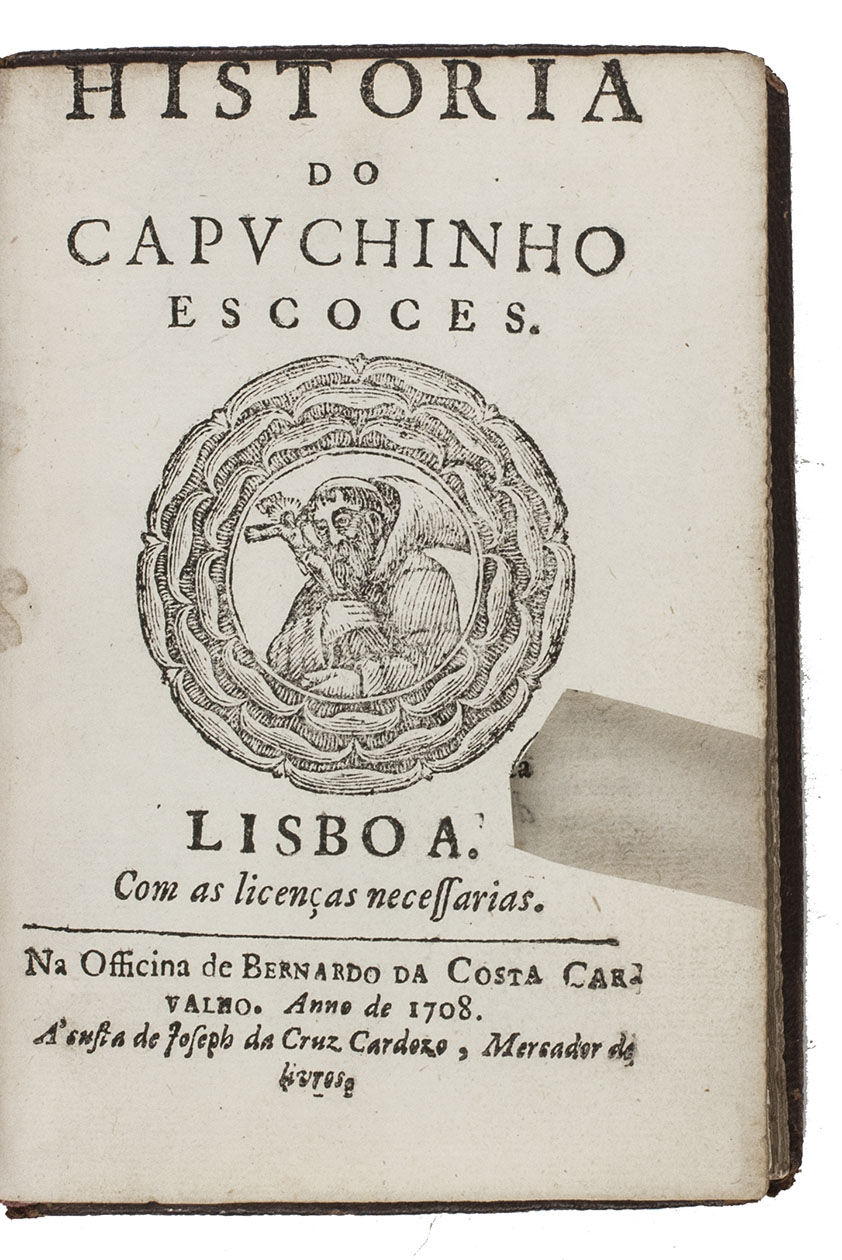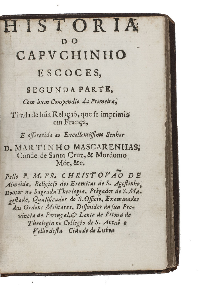 Very rare early (3rd?) Portuguese edition of a romanticized life of the Scottish Capucin friar George Leslie (d. 1637), known as "Father Archangel'', written by the Italian Archbishop of Fermo, Giovanno Battista Rinuccini, originally published in Italian with the title Il Cappuccino Scozzese (Macerata, Agostino Grisei, 1644) and in the present Portuguese translation in 1667 (the first part abbreviated from a 1657 Portuguese edition and the second translated from a 1662(?) French edition). All early editions are rare: we have located only two other copies of the present one, at the National Library of Scotland and the John Carter Brown Library.