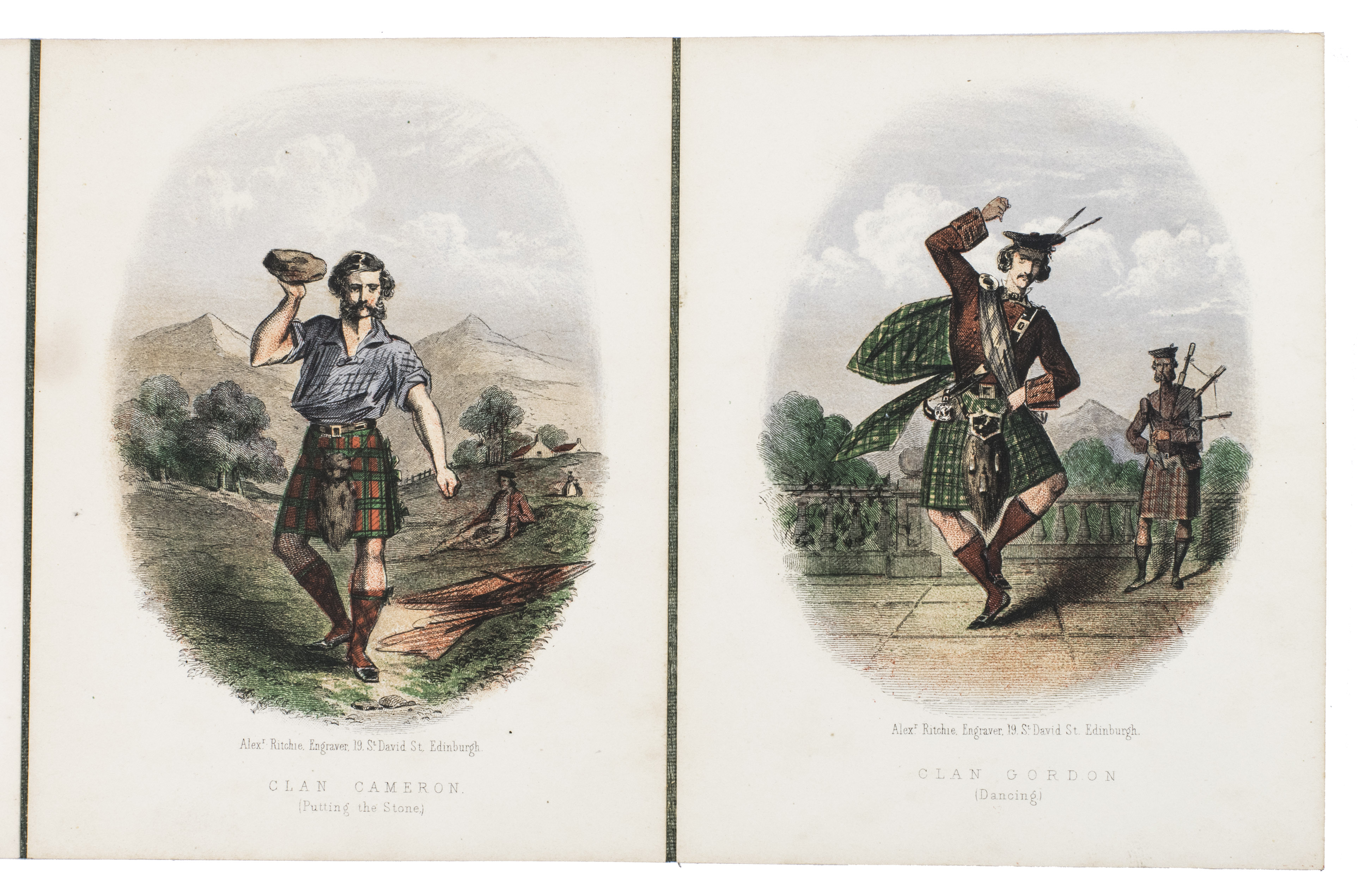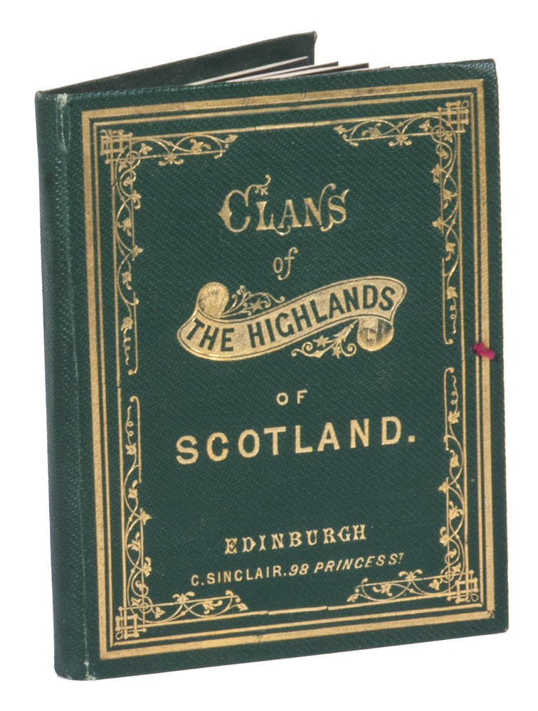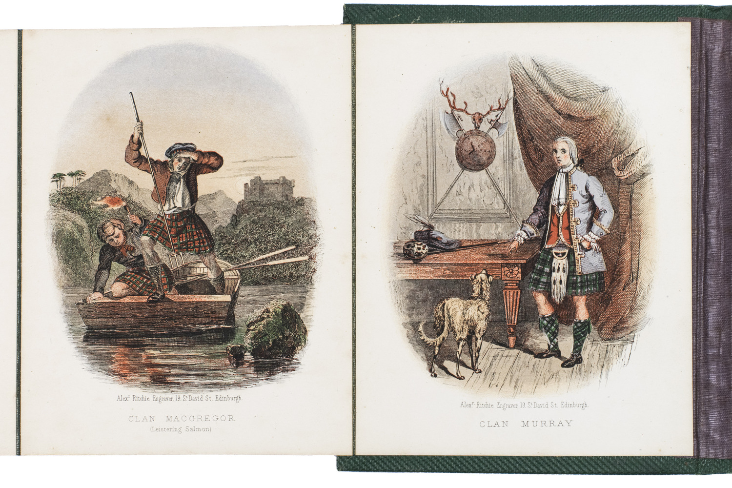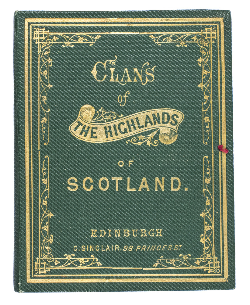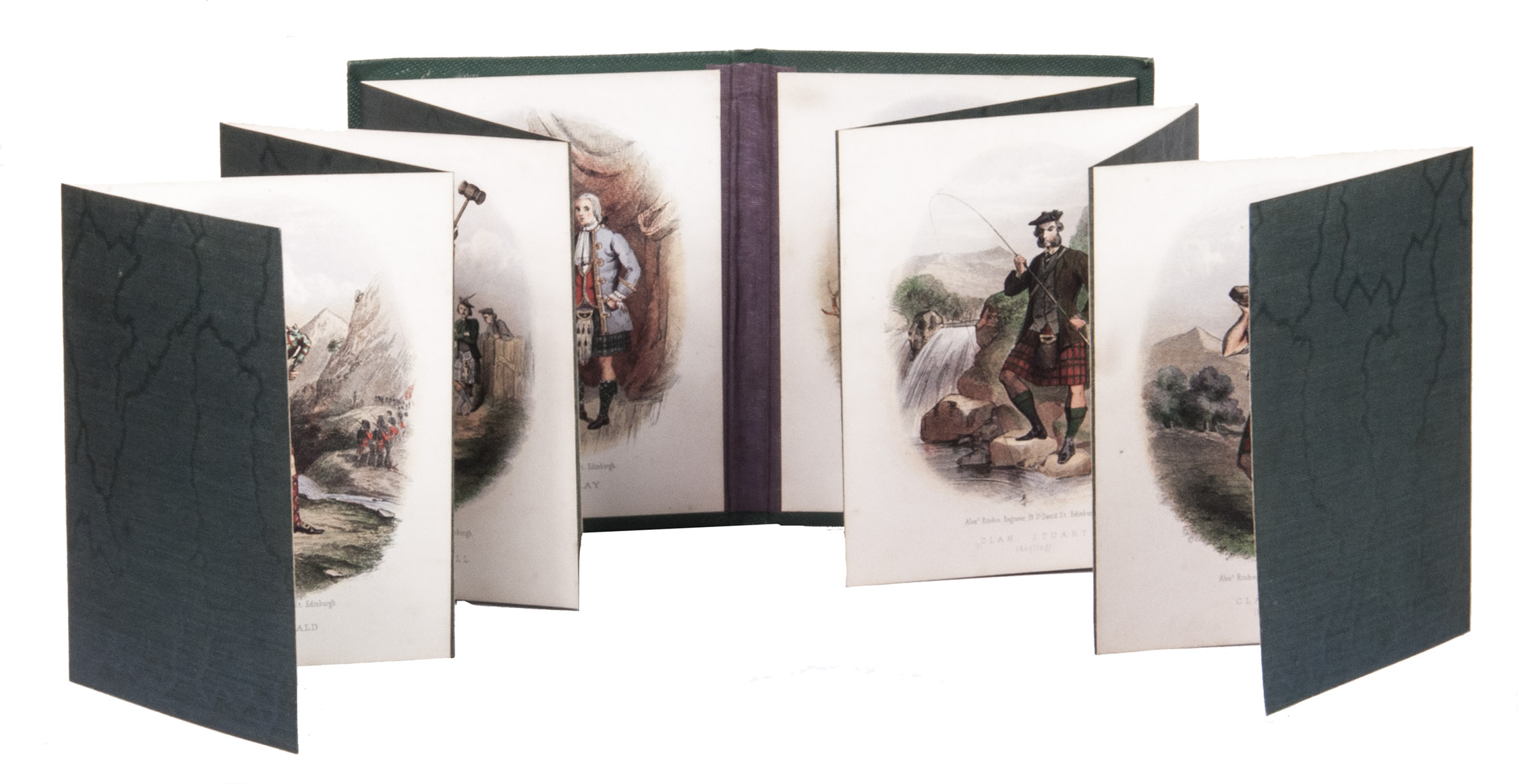 Edinburgh, C. Sinclair, [between 1850 and 1873]. 15.5 x 12 cm. With 12 very detailed, hand-coloured engravings of Scottish men representing 12 clans in their traditional tartans. All engravings are mounted on dark green moiré-grained cloth in 2 sets of 6, respectively folding out from the front and back pastedowns. All engravings are captioned in the plate, giving the name of the clan depicted and a short description of the scene, and signed by the engraver, Alexander Ritchie. Original publisher's gold- and blind-stamped green wave-grained cloth, with the title in gold within an elaborate gold-stamped frame on the front board and a blind-stamped ornamental oval centrepiece (a personification of Scotland?) within an elaborate blind-stamped frame on the back board, remnants of red cloth ties. [2 sets of 6 engravings folding out].